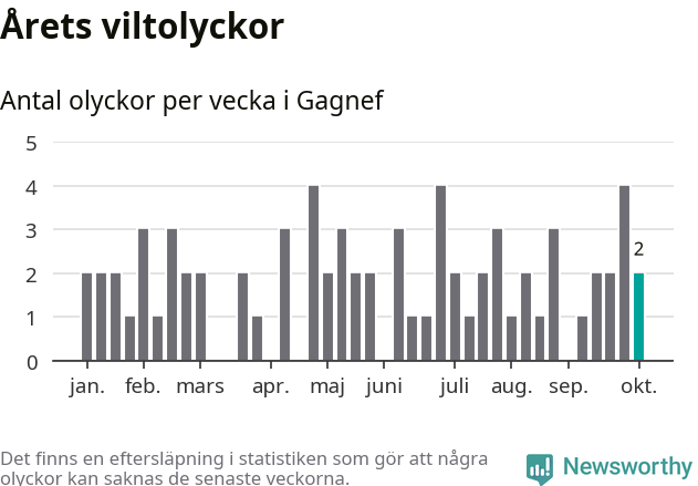 Totalt det här året har det inträffat 73 viltolyckor i kommunen. Det är mindre än genomsnittet för motsvarande period (omkring 88) de senaste tio åren.