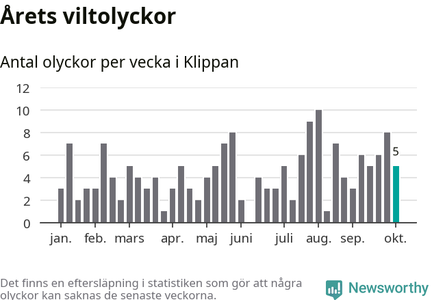 Hittills har fem viltolyckor rapporterats in i Klippans kommun från vecka 41. Se listan här.