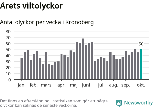 Hittills har 50 viltolyckor rapporterats in i Kronobergs län från vecka 41. Se listan här.