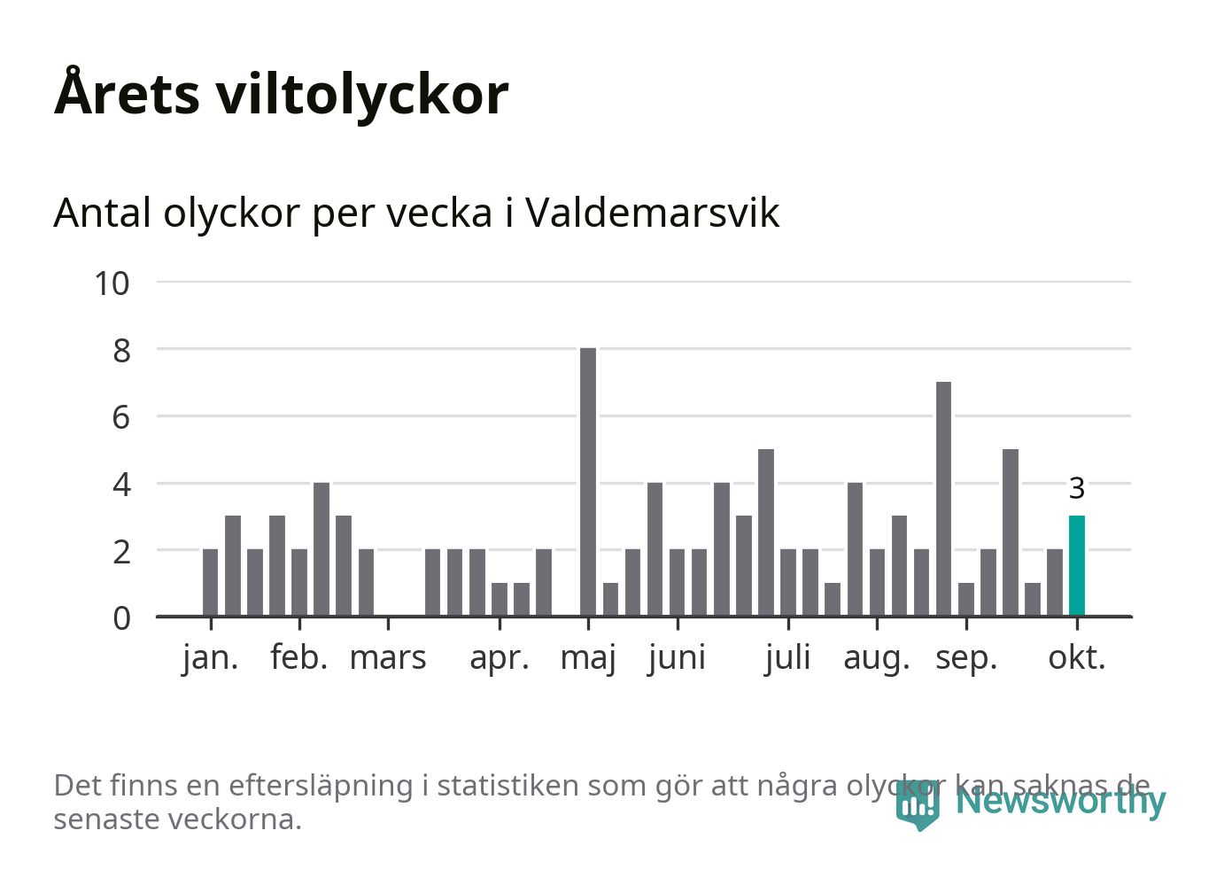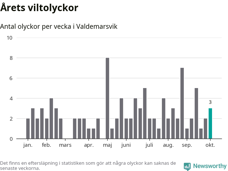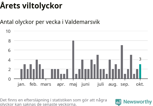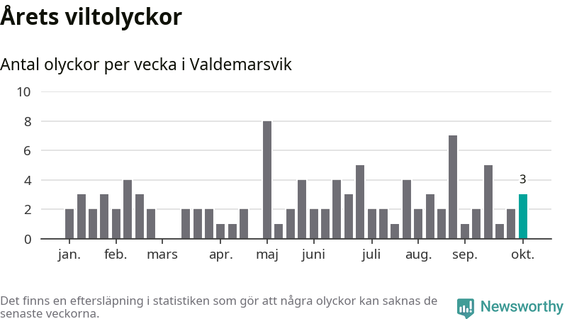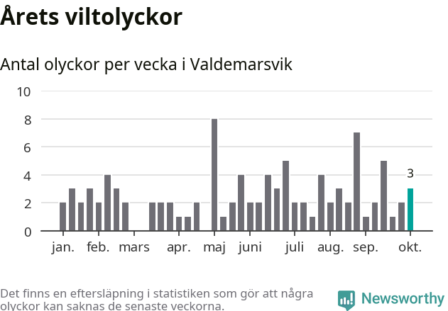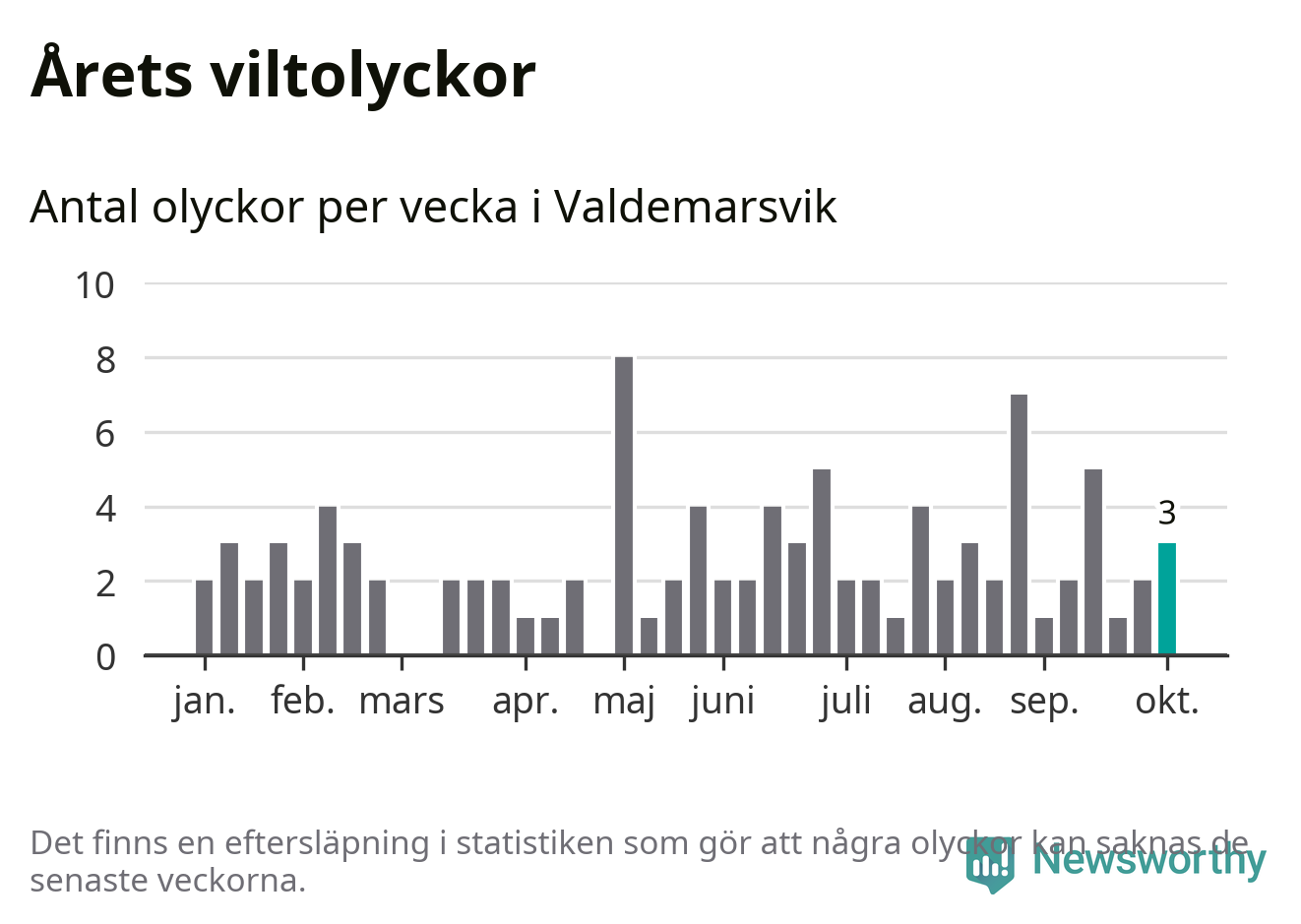 Hittills har tre viltolyckor rapporterats in i Valdemarsviks kommun från vecka 41. Se listan här.