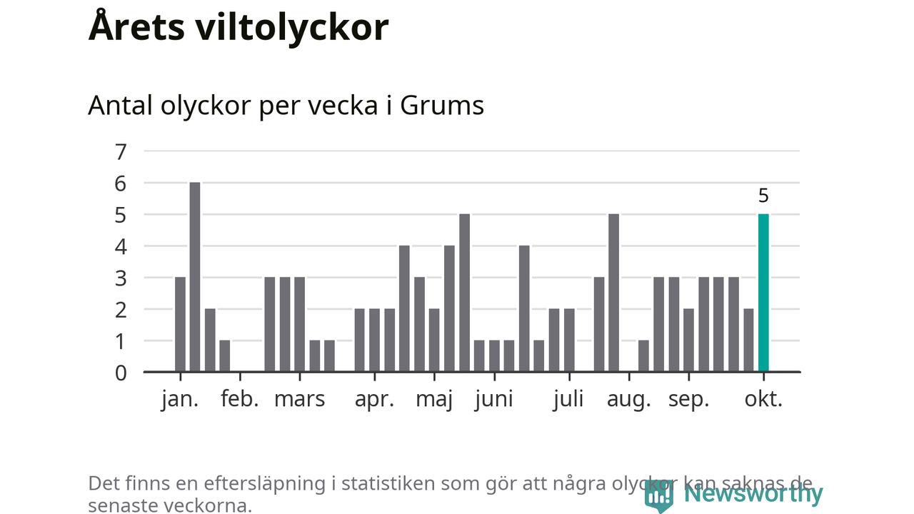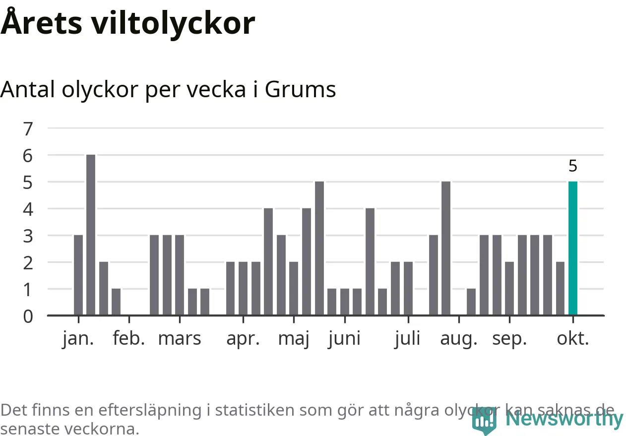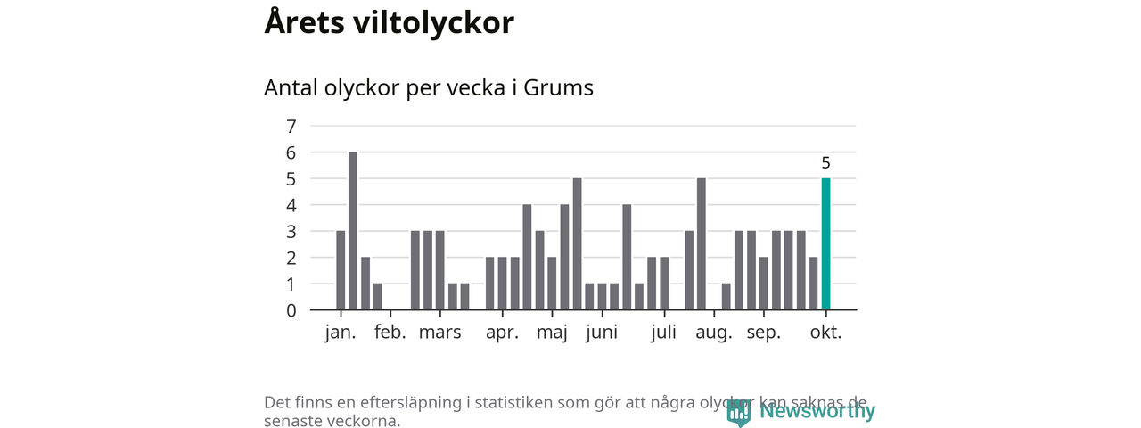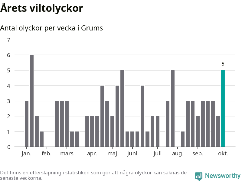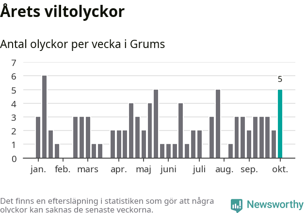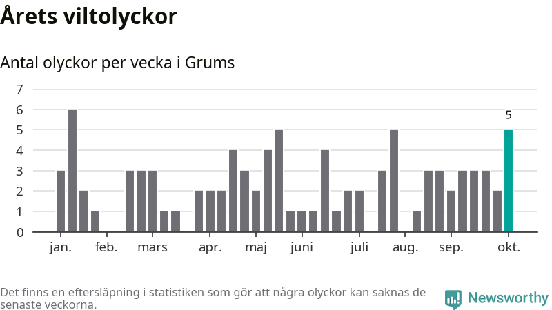 Hittills har fem viltolyckor rapporterats in i Grums kommun från vecka 41. Se listan här.