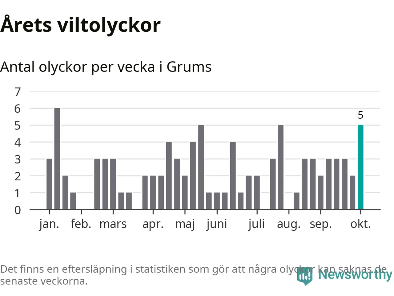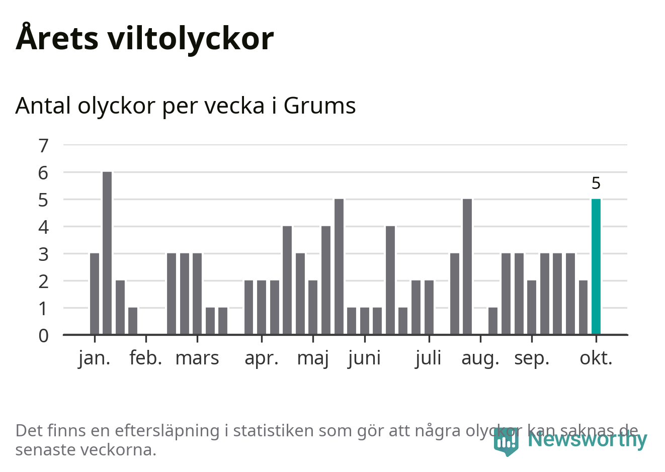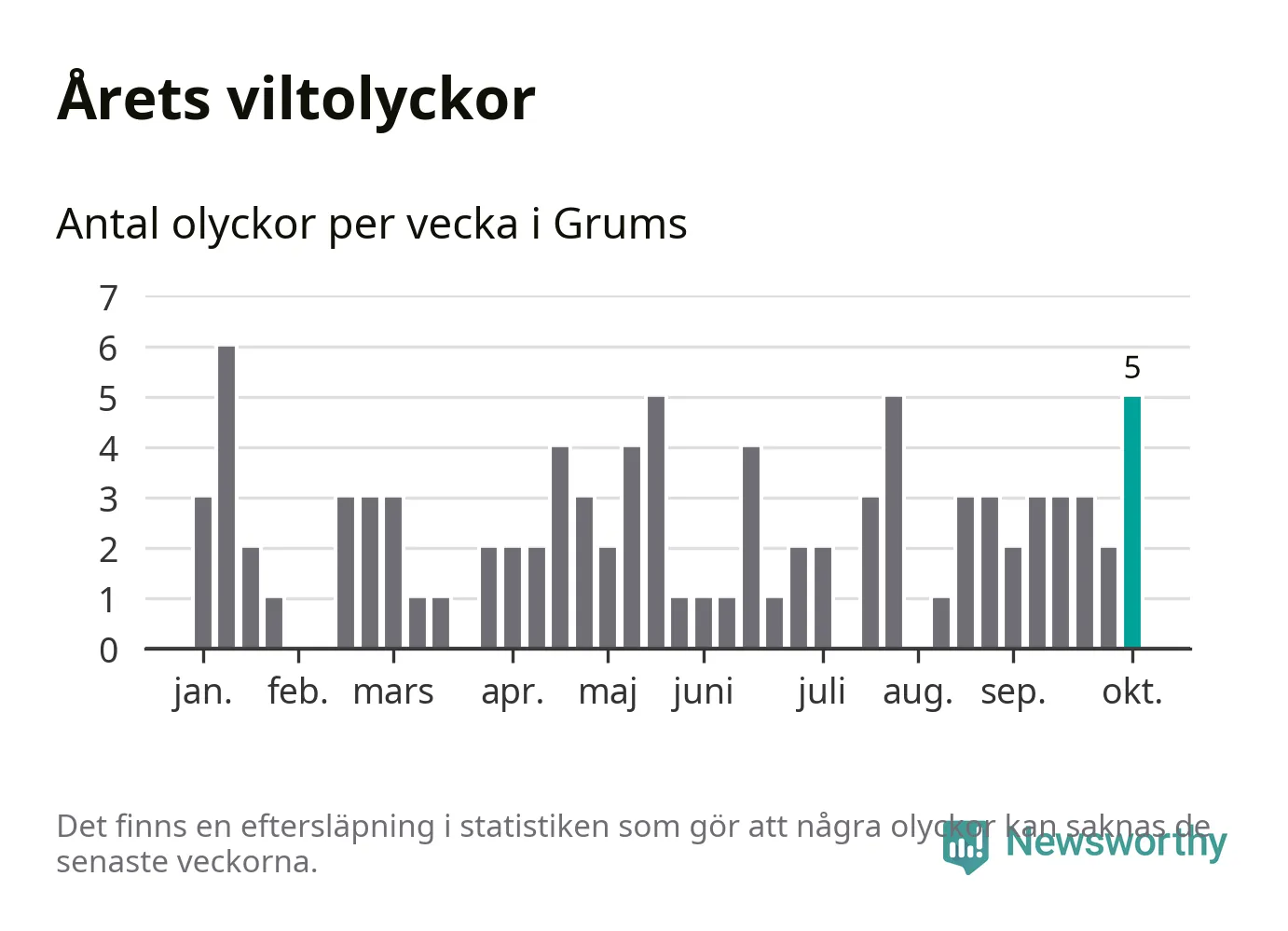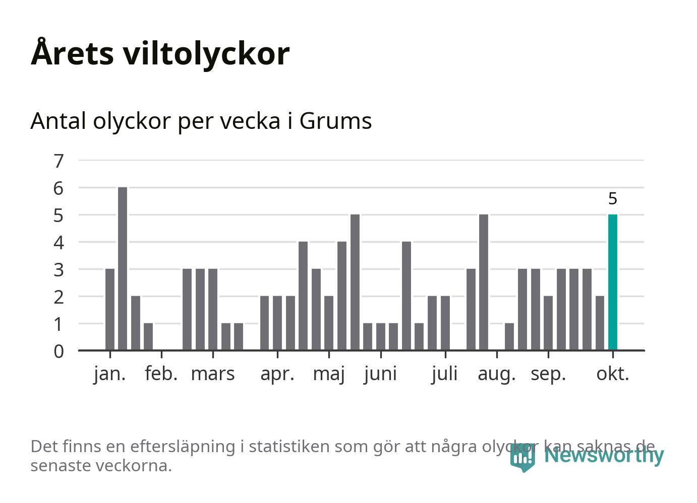 Hittills har fem viltolyckor rapporterats in i Grums kommun från vecka 41. Se listan här.