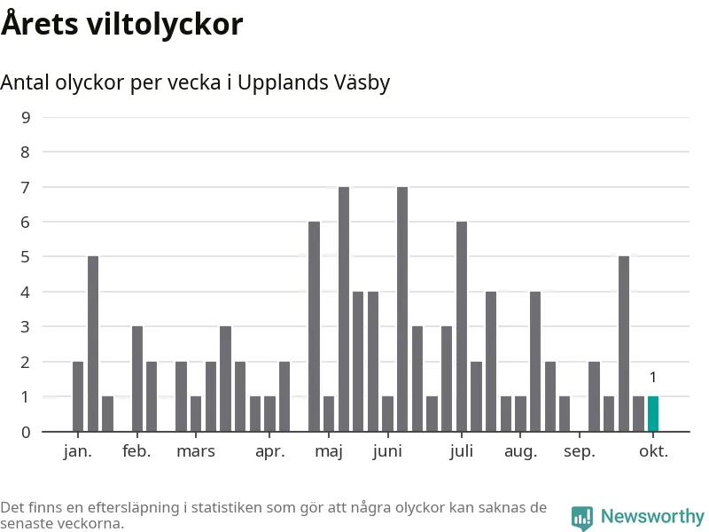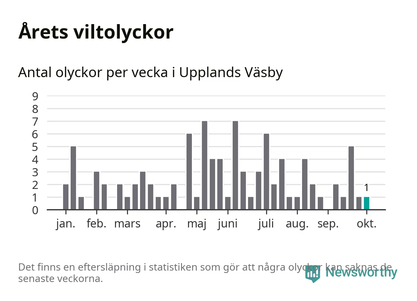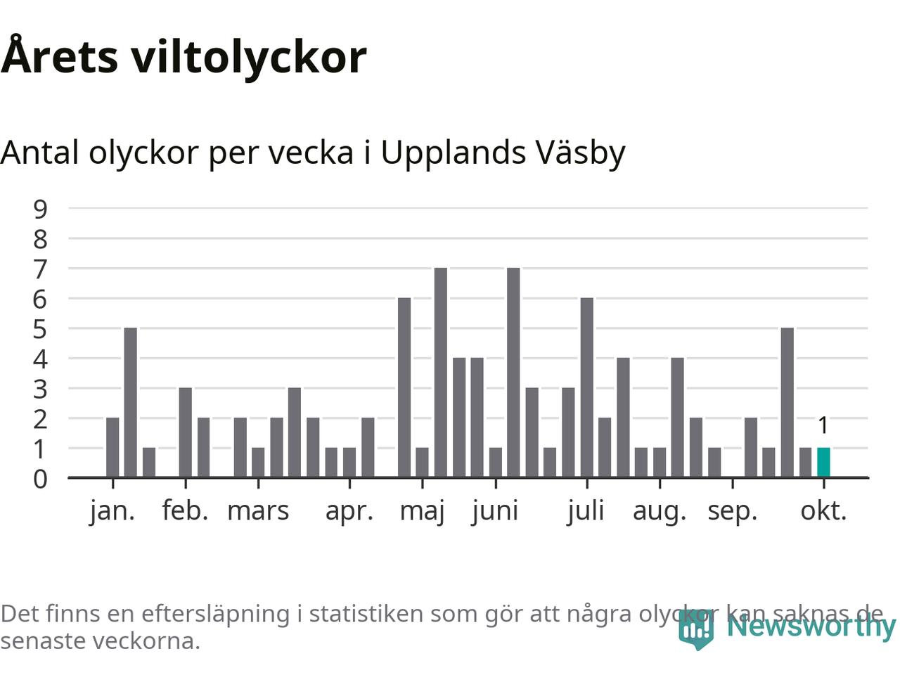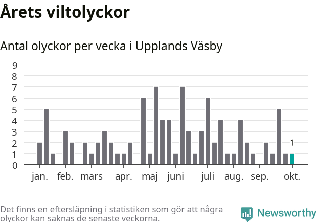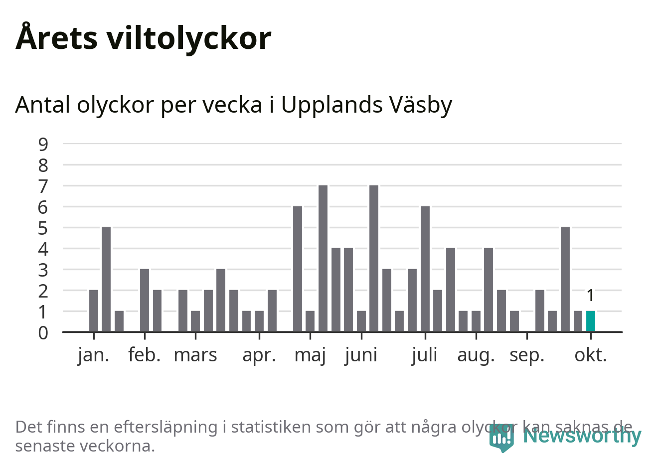 Från förra veckan (vecka 41) har hittills en viltolycka rapporterats in i Upplands Väsby kommun.