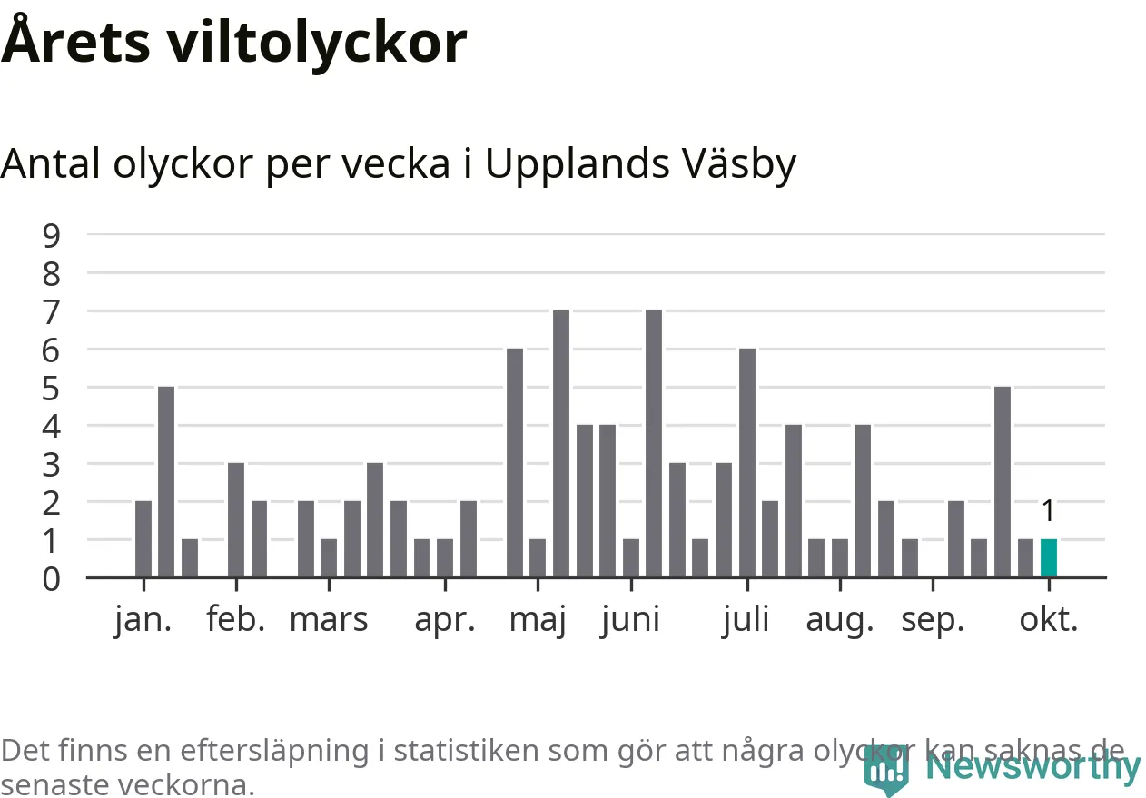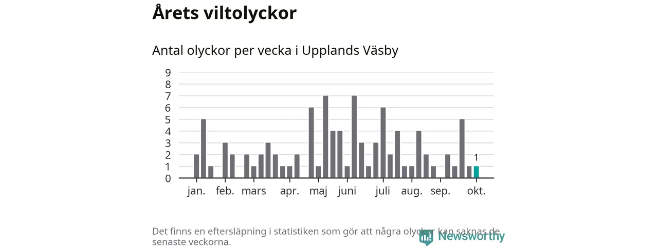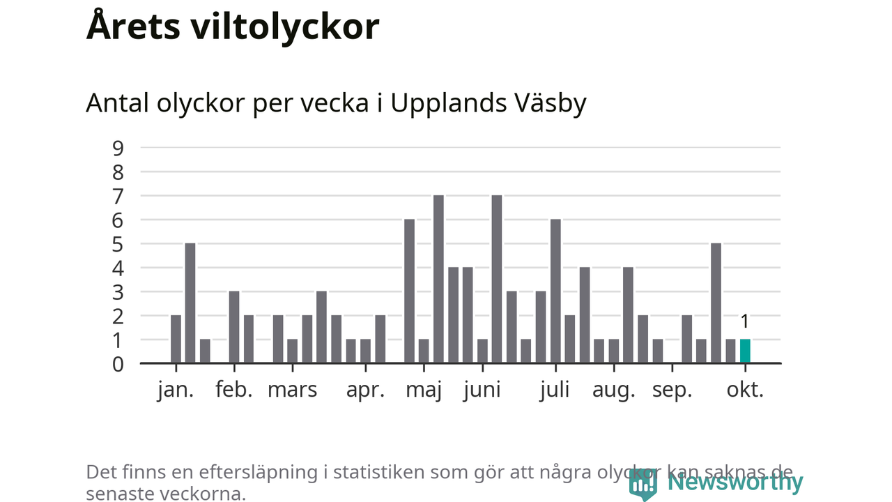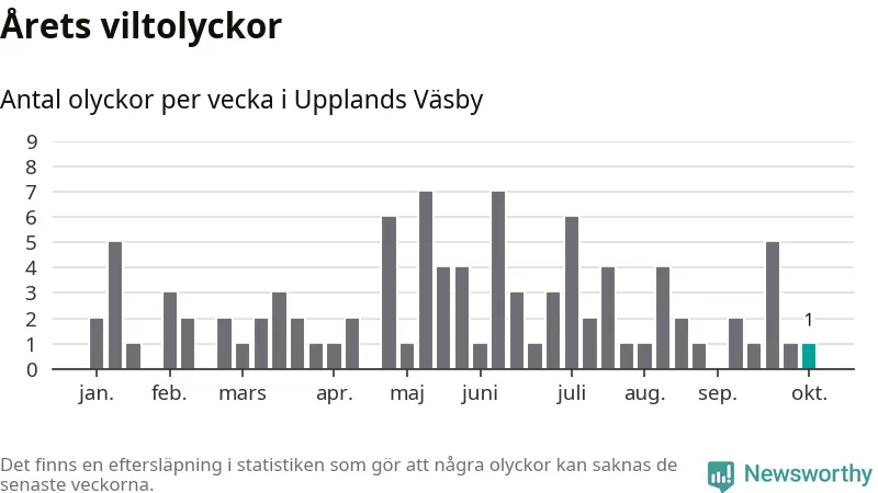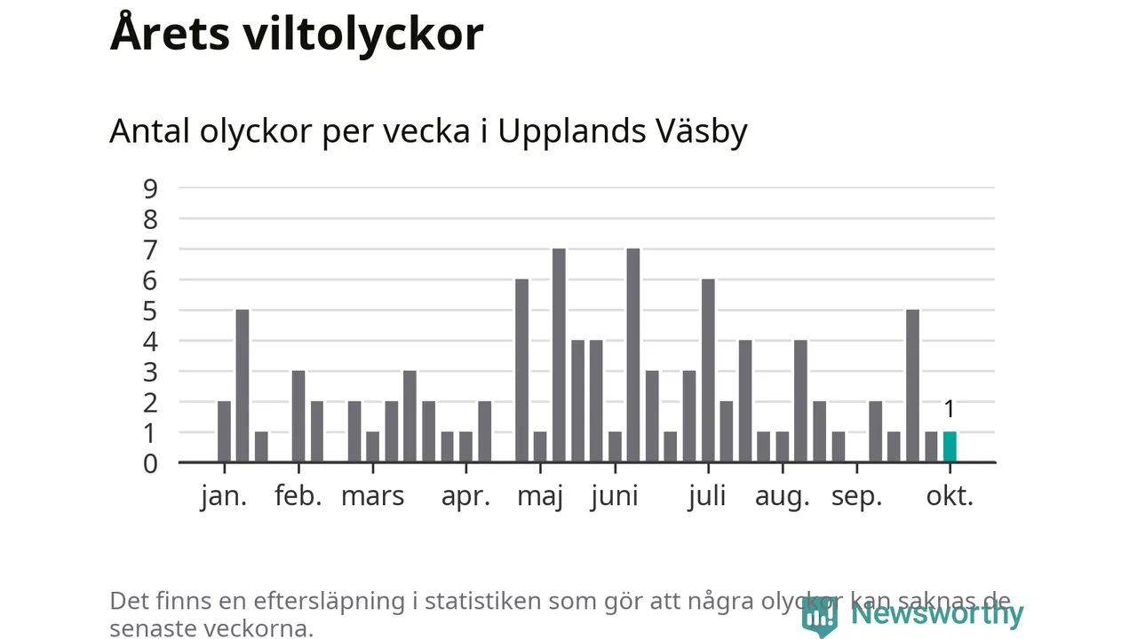 Från förra veckan (vecka 41) har hittills en viltolycka rapporterats in i Upplands Väsby kommun.