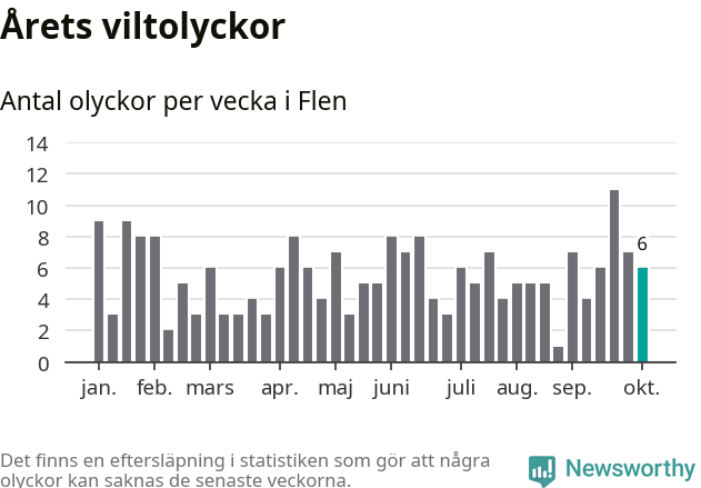 Hittills har sex viltolyckor rapporterats in i Flens kommun från vecka 41. Se listan här.