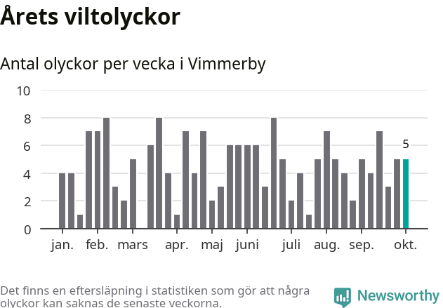 Hittills har fem viltolyckor rapporterats in i Vimmerby kommun från vecka 41. Se listan här.