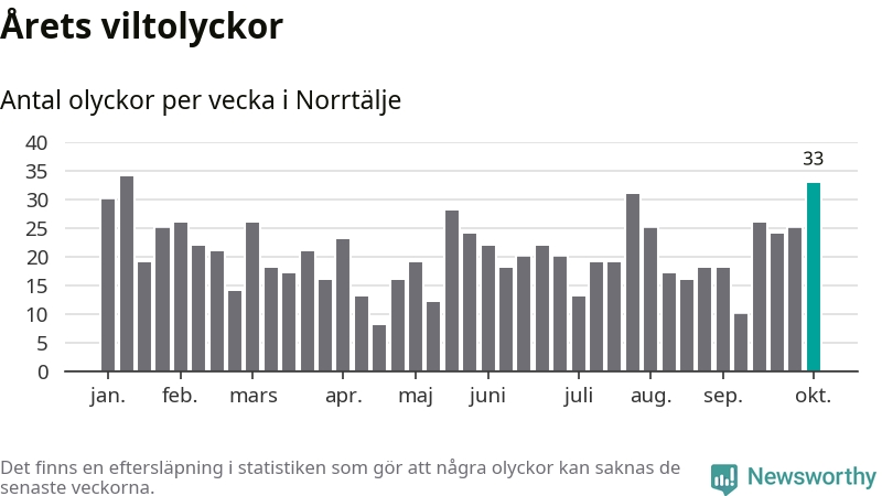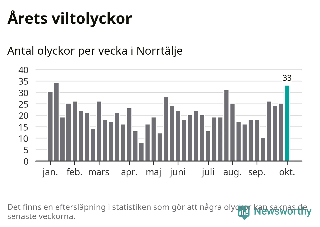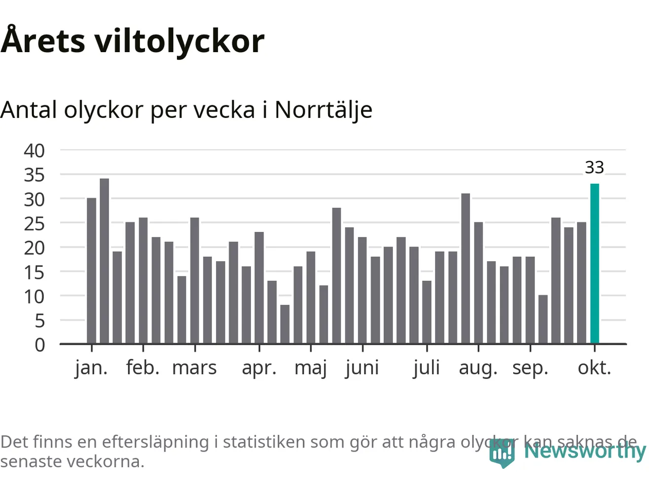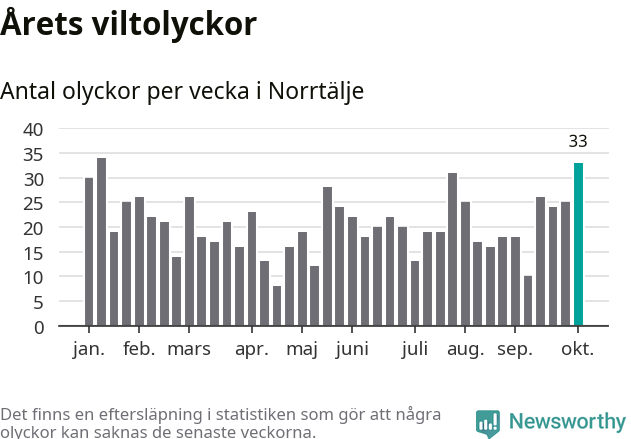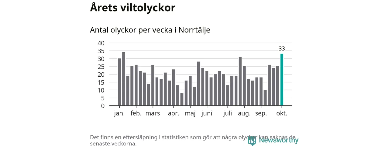 Hittills har 33 viltolyckor rapporterats in i Norrtälje kommun från vecka 41. Se listan här.