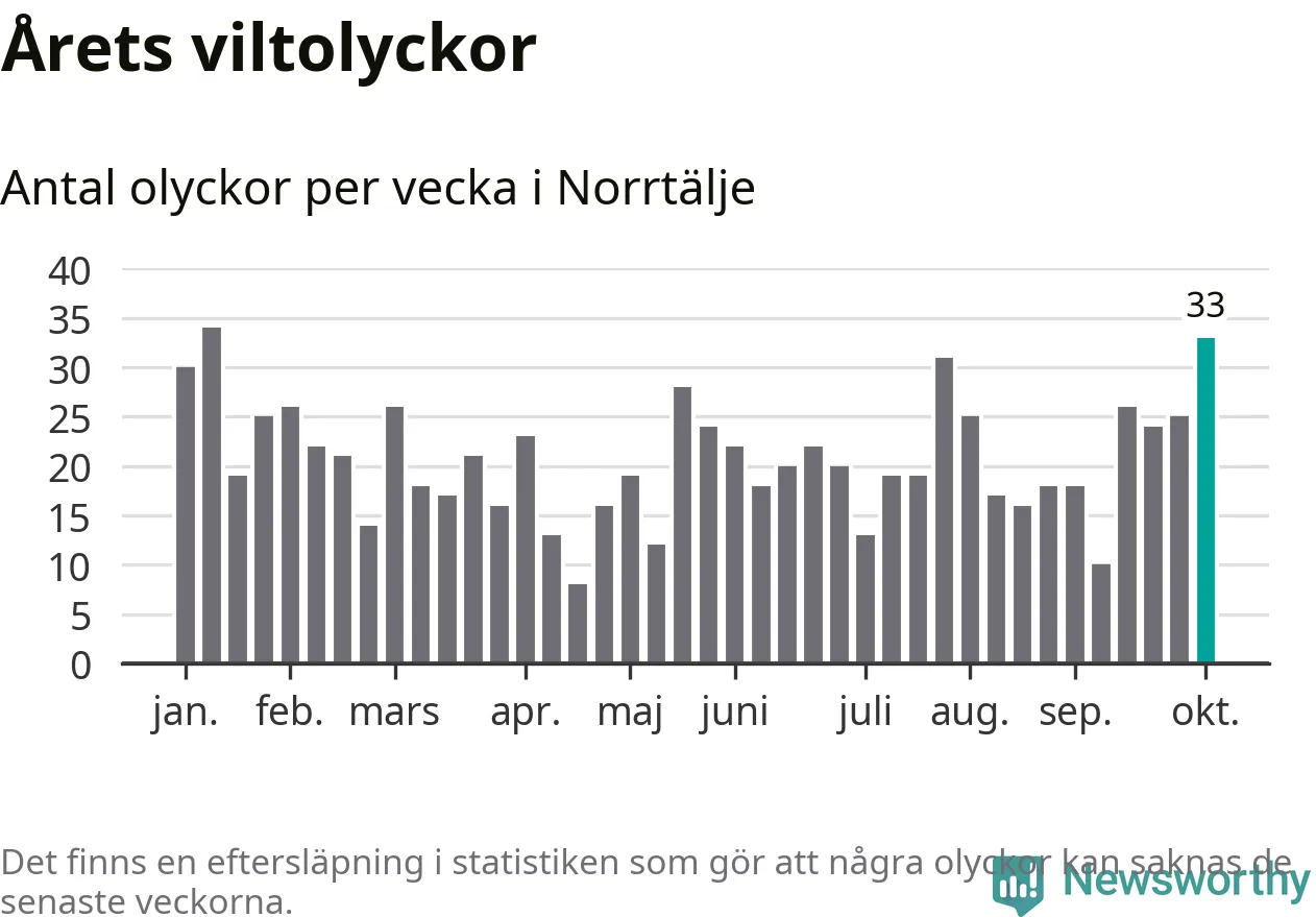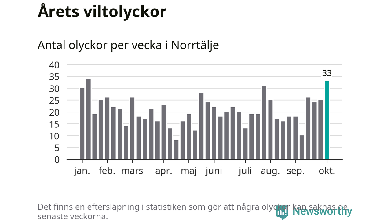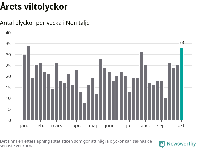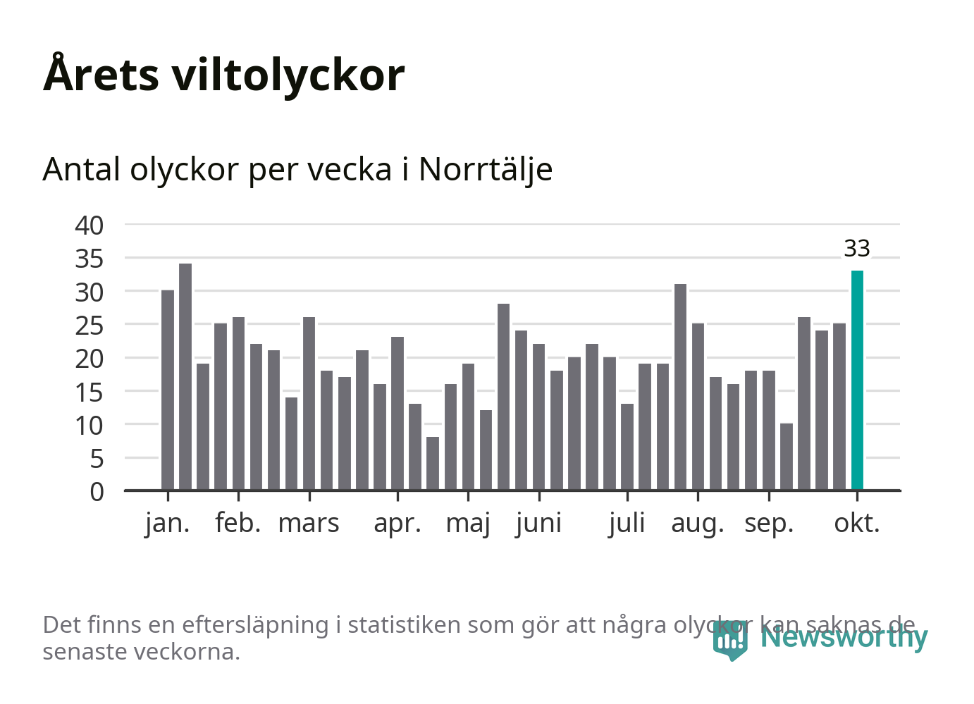 Hittills har 33 viltolyckor rapporterats in i Norrtälje kommun från vecka 41. Se listan här.