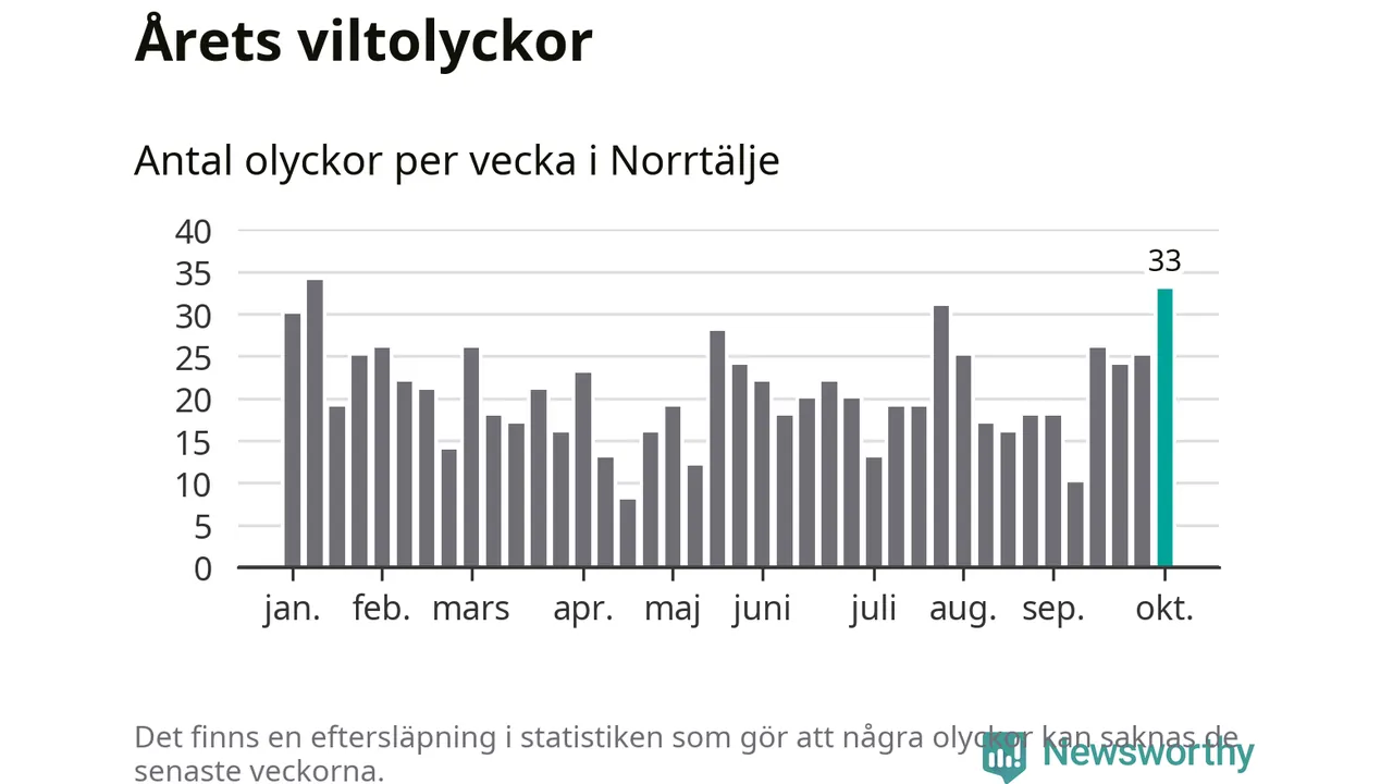 Totalt det här året har det inträffat 844 viltolyckor i kommunen. Det är mer än genomsnittet för motsvarande period (omkring 714) de senaste tio åren.