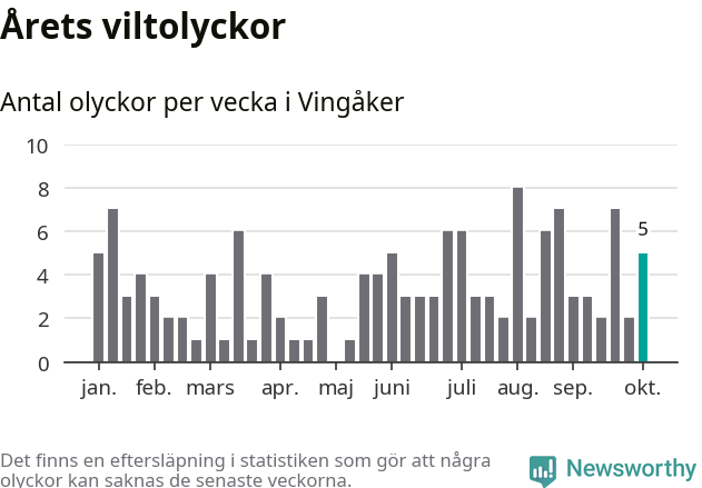 Hittills har fem viltolyckor rapporterats in i Vingåkers kommun från vecka 41. Se listan här.
