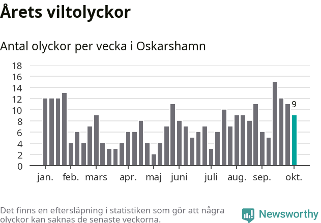 Hittills har nio viltolyckor rapporterats in i Oskarshamns kommun från vecka 41. Se listan här.