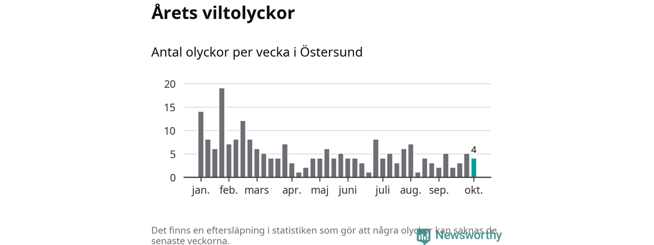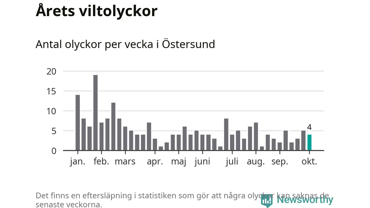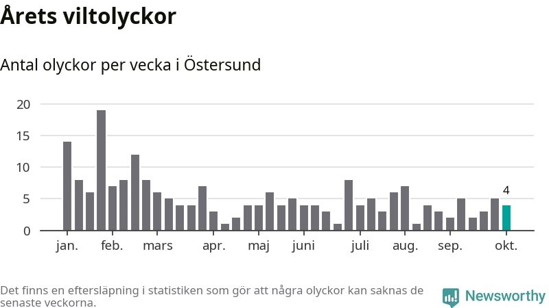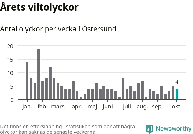 Viltolyckorna är som flest under vår och höst, men vilken typ av vilt varierar med årstiden. Så här års är det vanligast med rådjursolyckor i Östersund, sett till de senaste tio årens statistik. I statistiken ingår inte olyckor med ren, som här räknas som tamdjur.