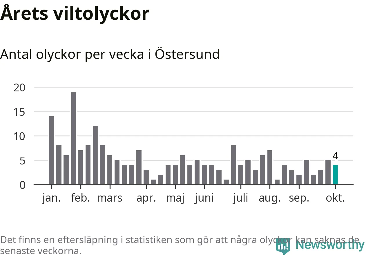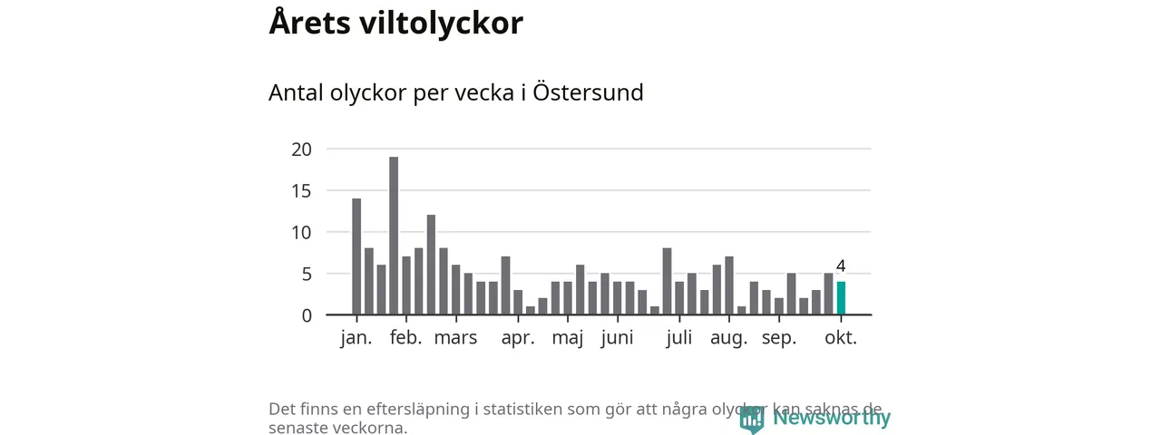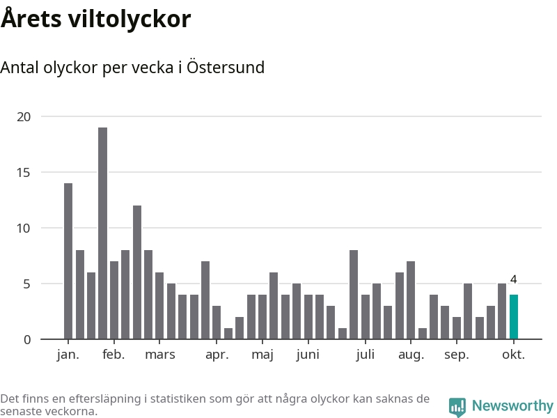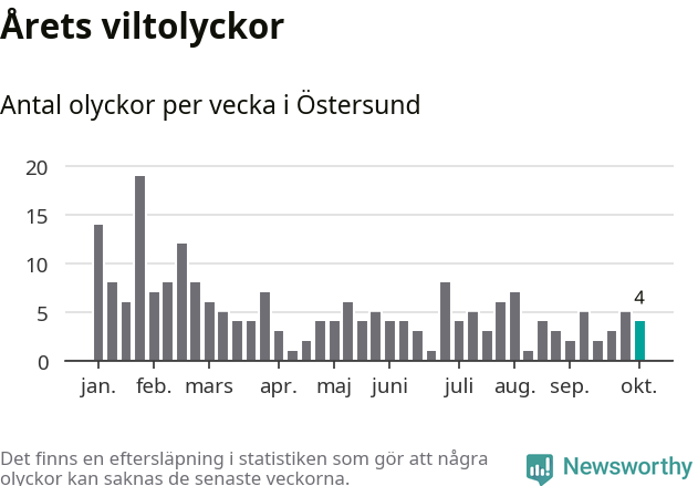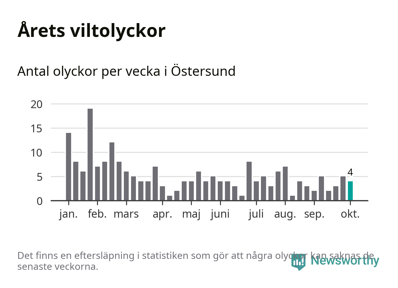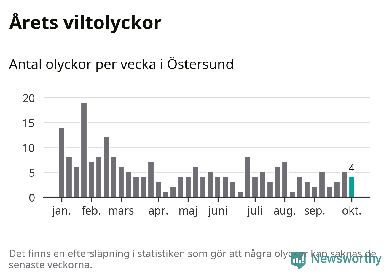 Hittills har fyra viltolyckor rapporterats in i Östersunds kommun från vecka 41. Se listan här.