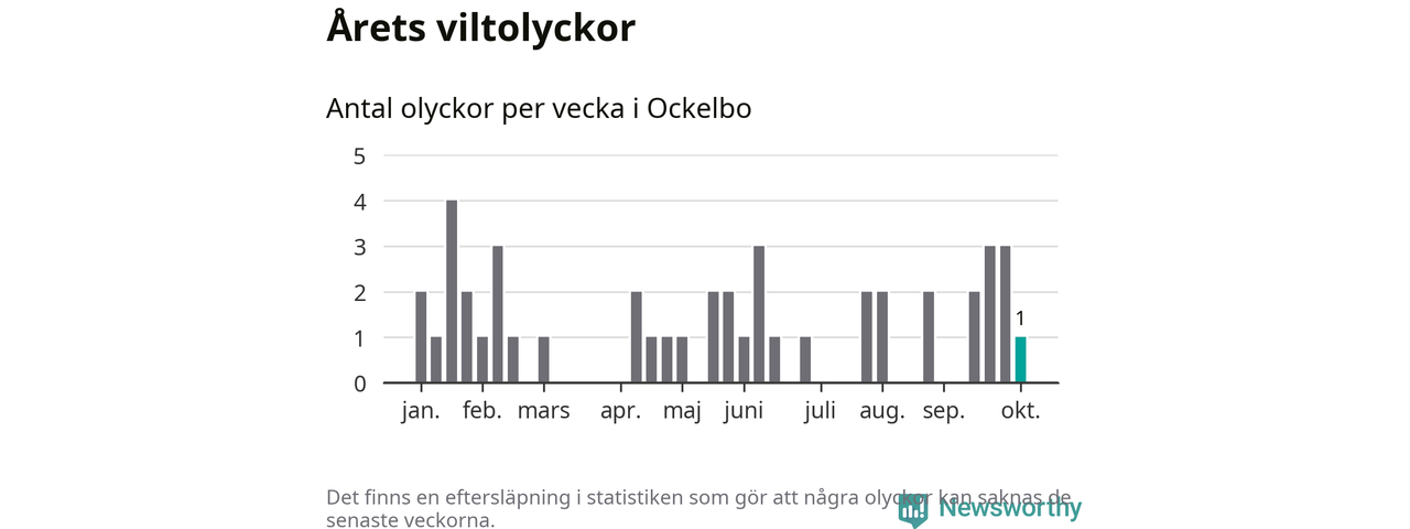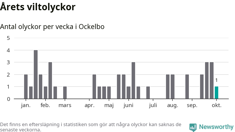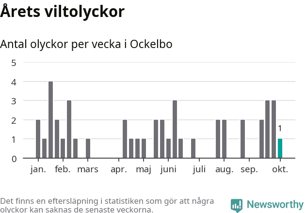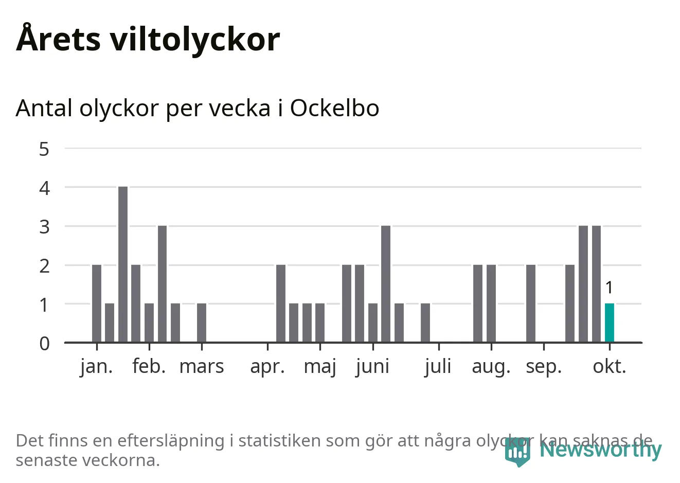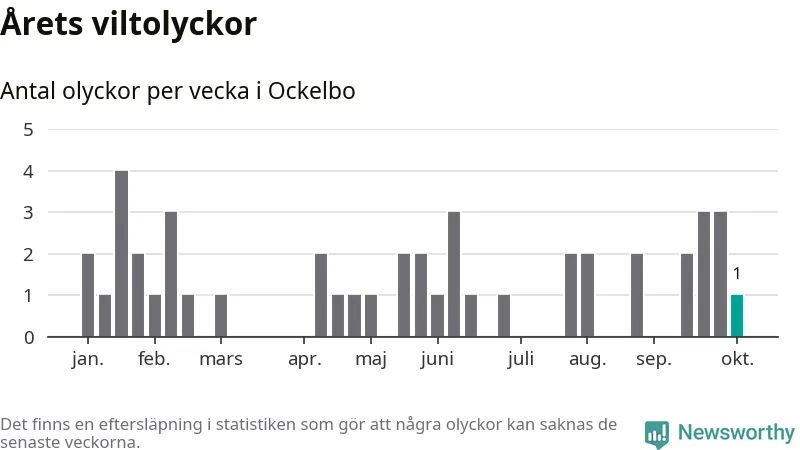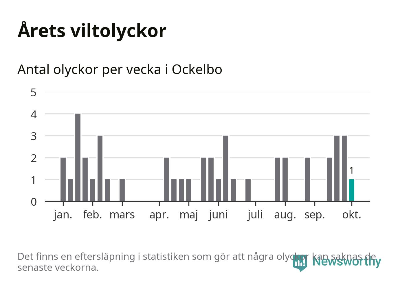 Från förra veckan (vecka 41) har hittills en viltolycka rapporterats in i Ockelbo kommun.
