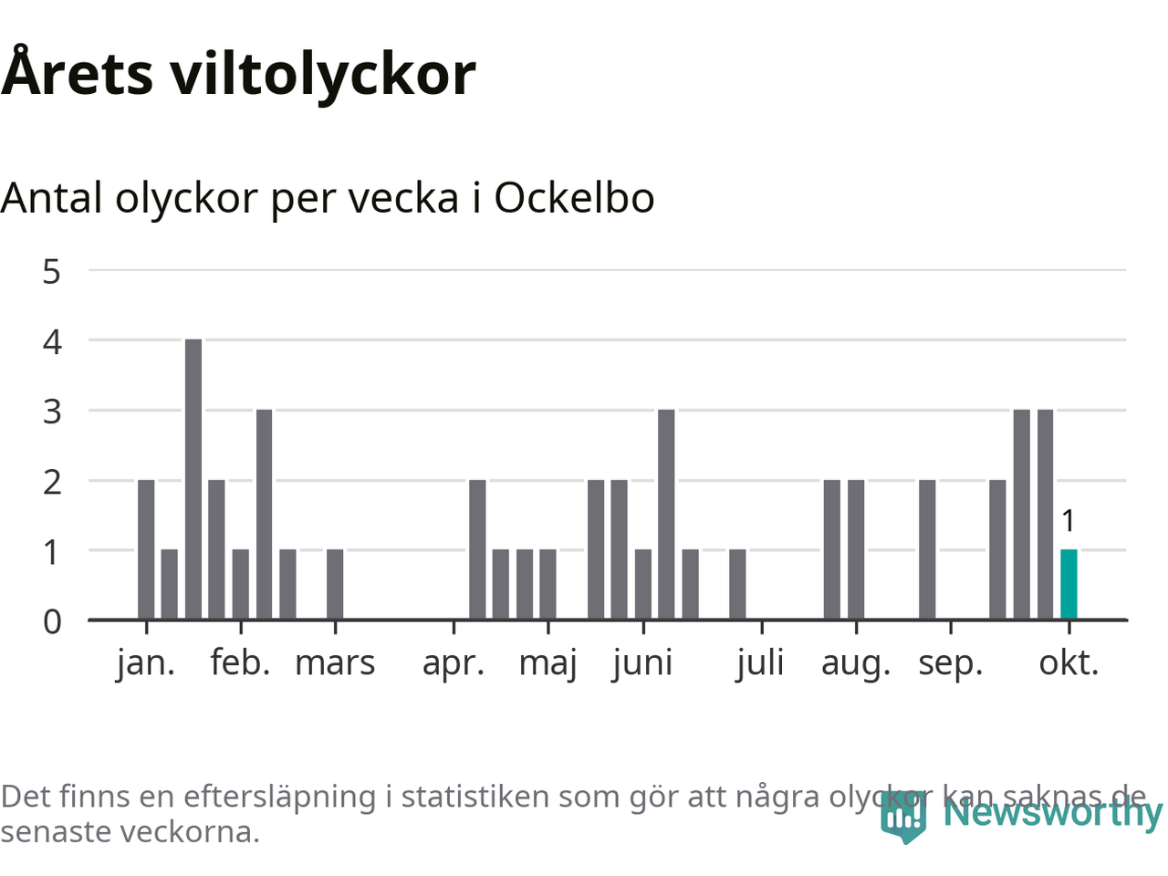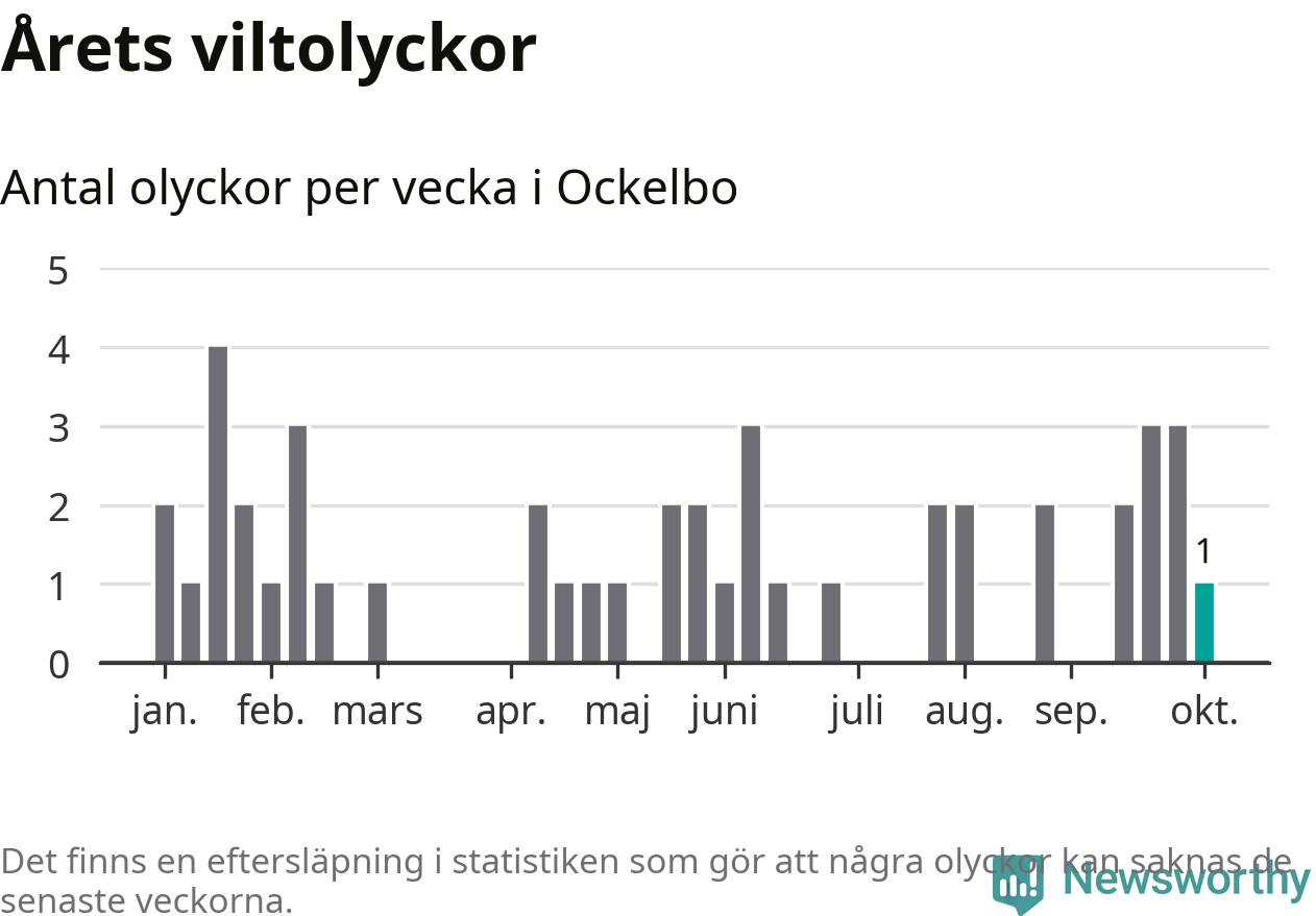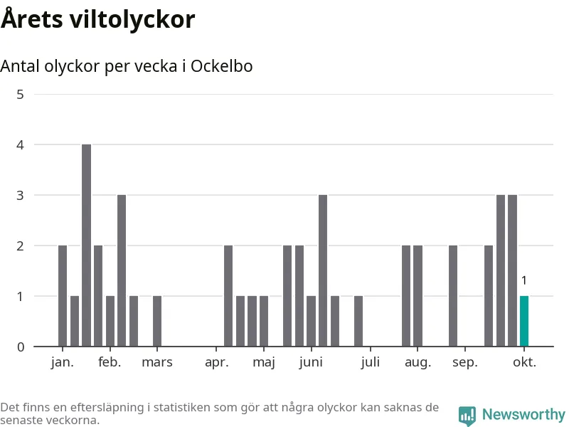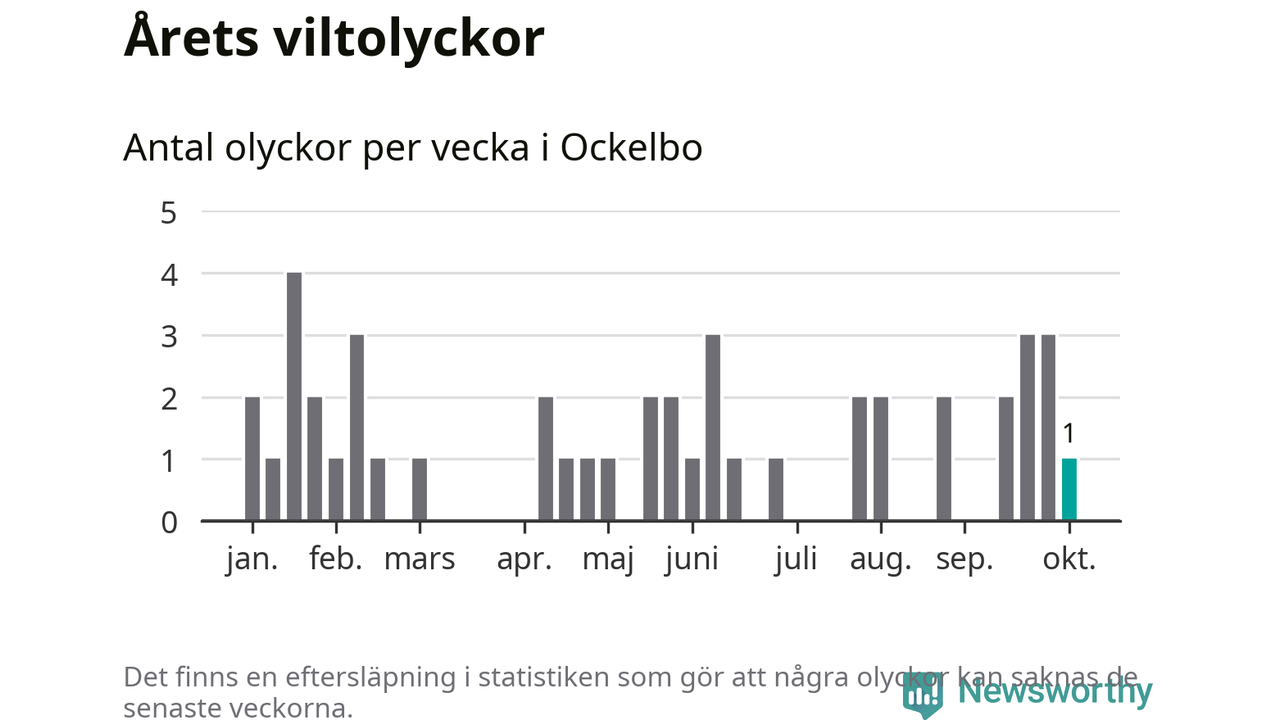 Från förra veckan (vecka 41) har hittills en viltolycka rapporterats in i Ockelbo kommun.