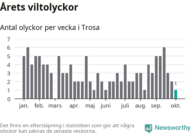 Från förra veckan (vecka 41) har hittills en viltolycka rapporterats in i Trosa kommun.