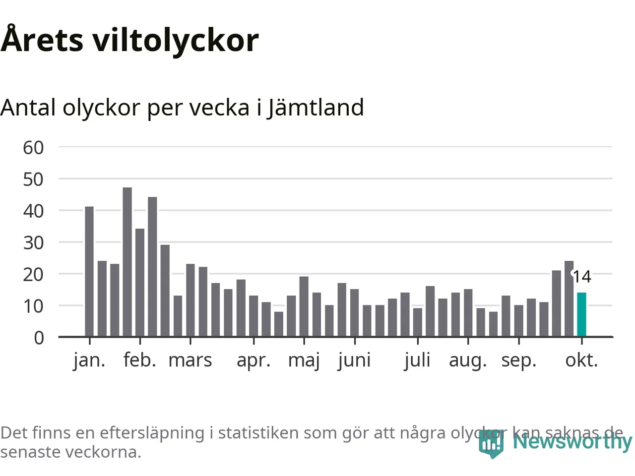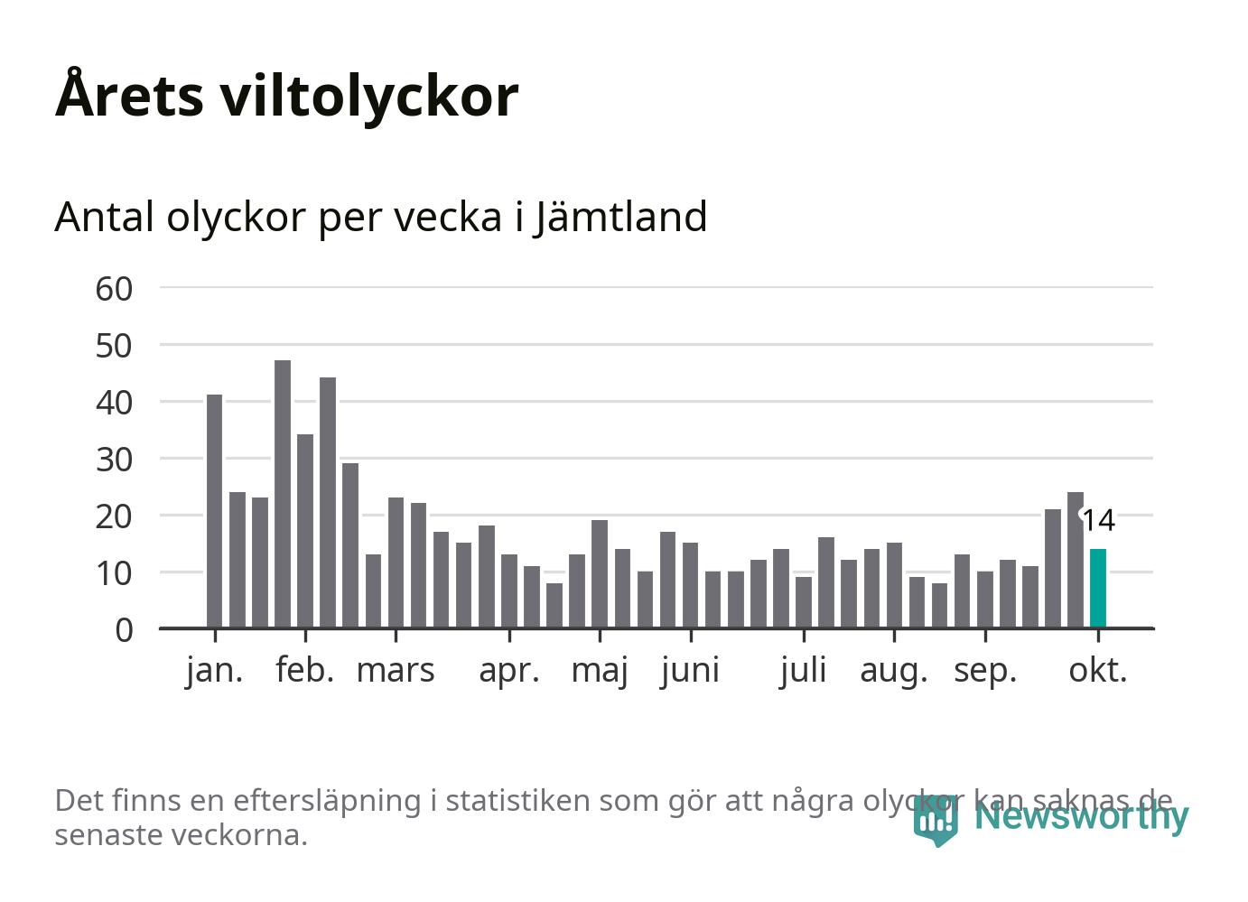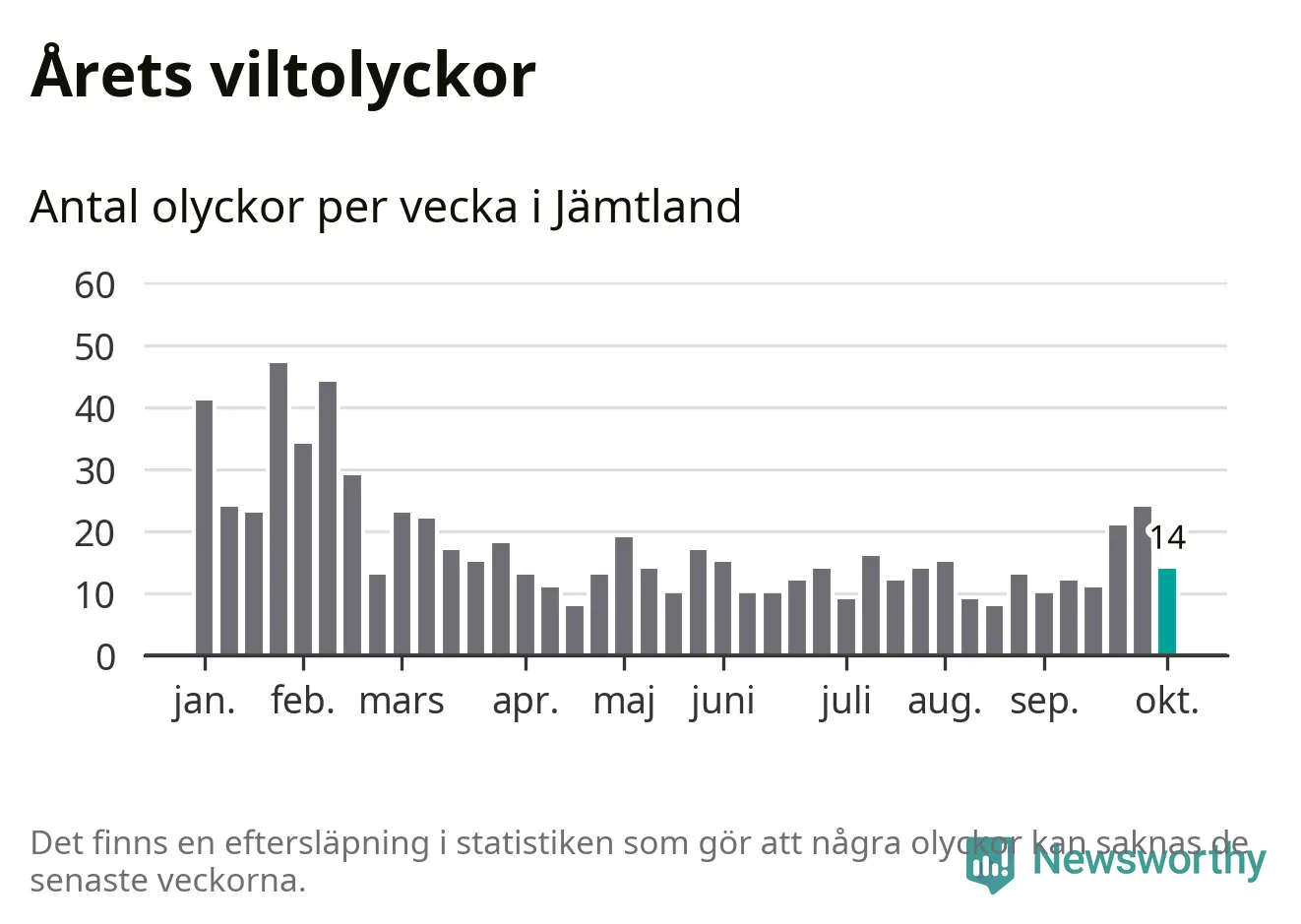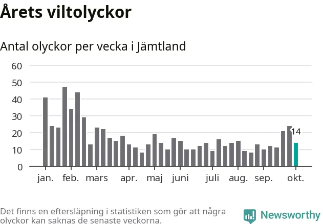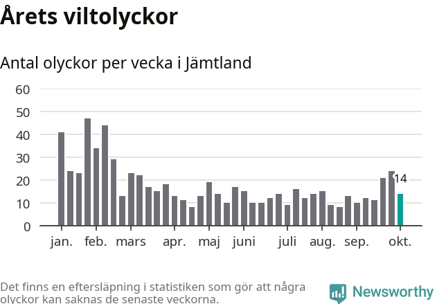 sett till de senaste tio årens statistik. I statistiken ingår inte olyckor med ren, som här räknas som tamdjur.