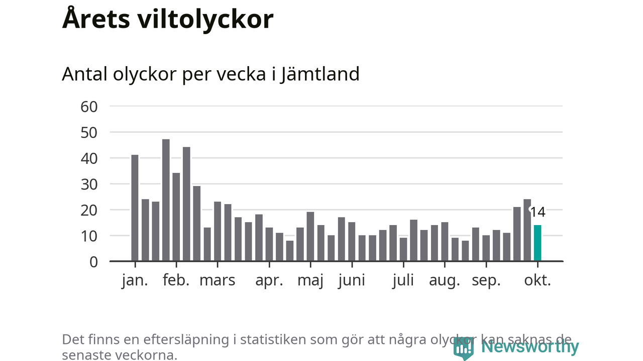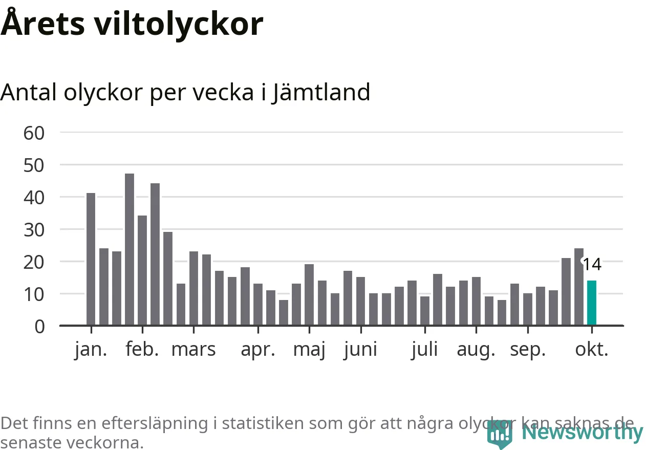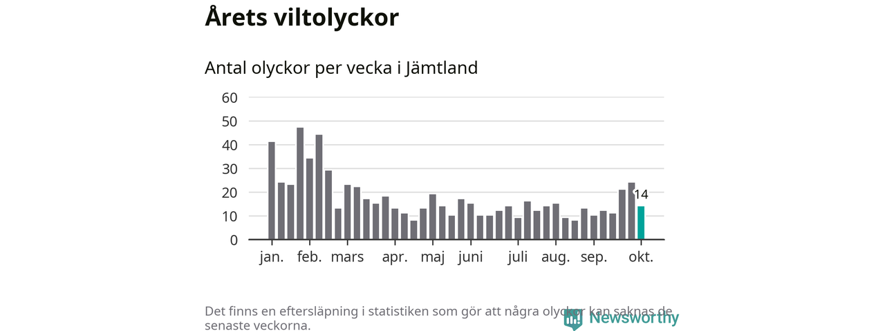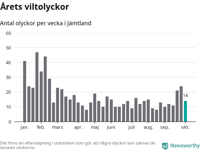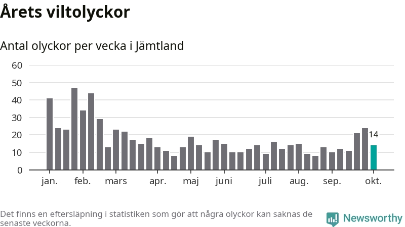 sett till de senaste tio årens statistik. I statistiken ingår inte olyckor med ren, som här räknas som tamdjur.