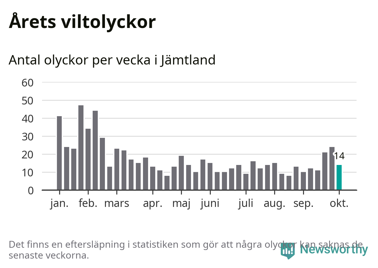 751 viltolyckor i länet. Det är en normal nivå i förhållande till hur det har sett ut under de senaste tio åren – genomsnittet för motsvarande period är 780.