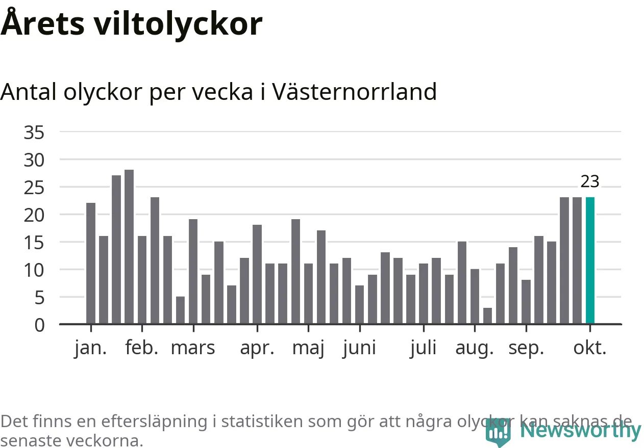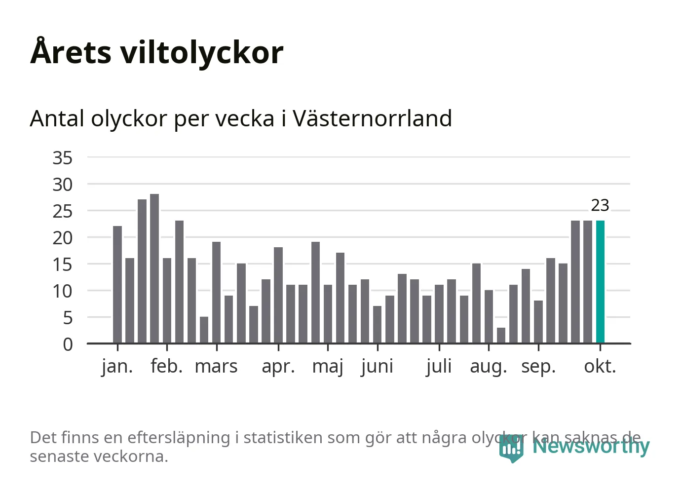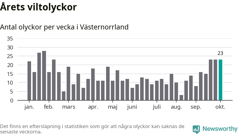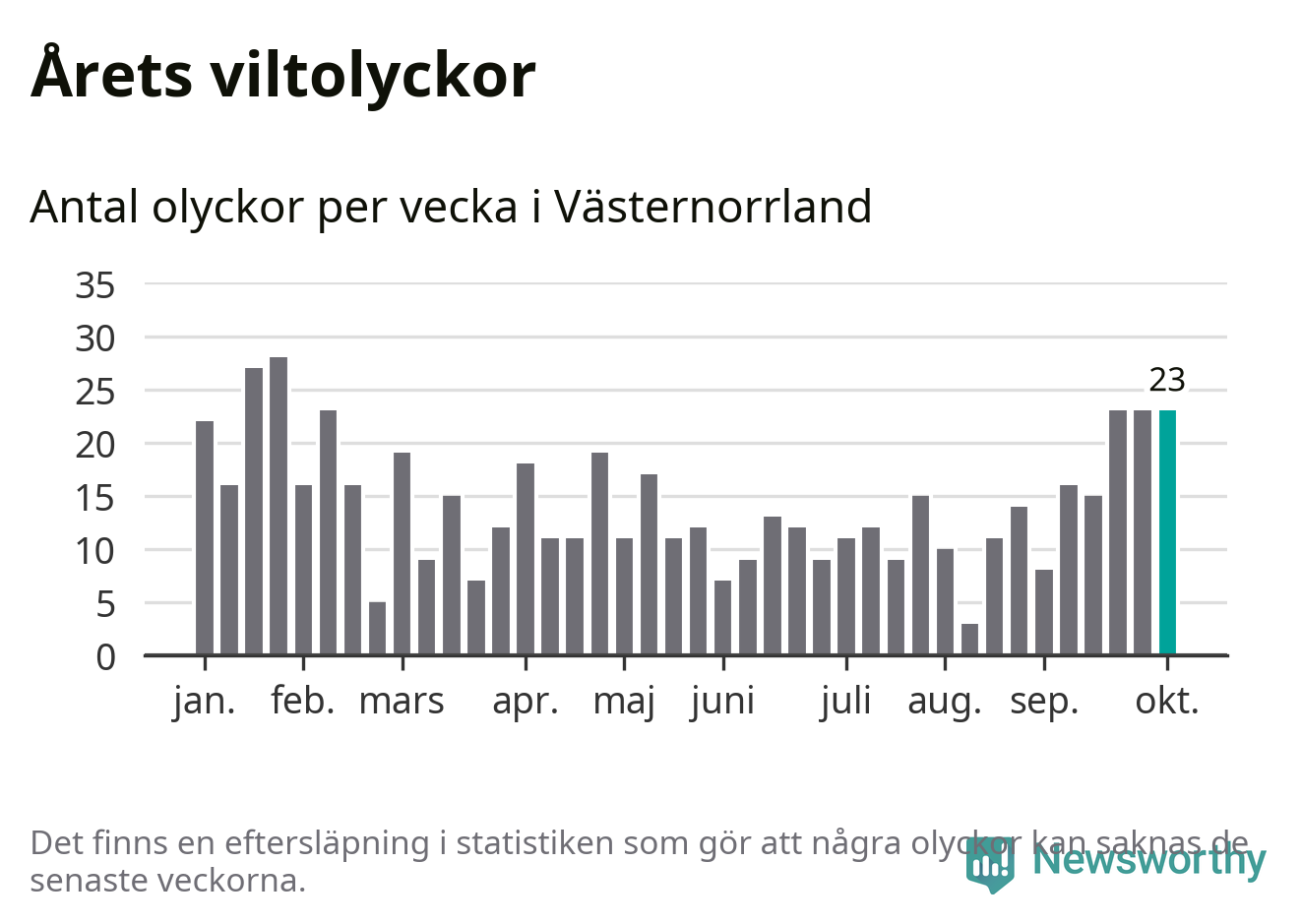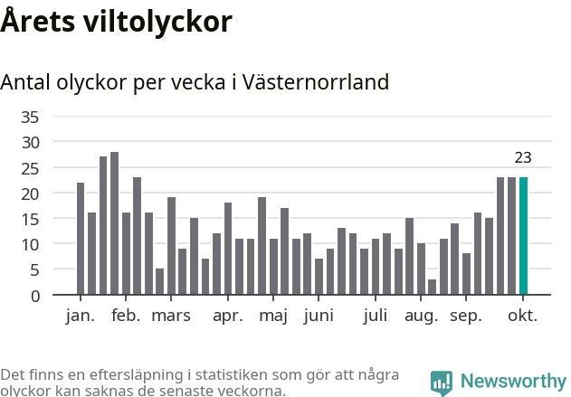 Hittills har 23 viltolyckor rapporterats in i Västernorrlands län från vecka 41. Se listan här.