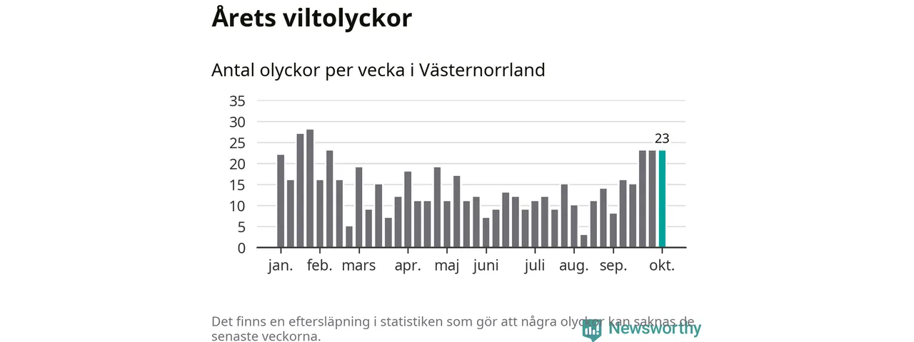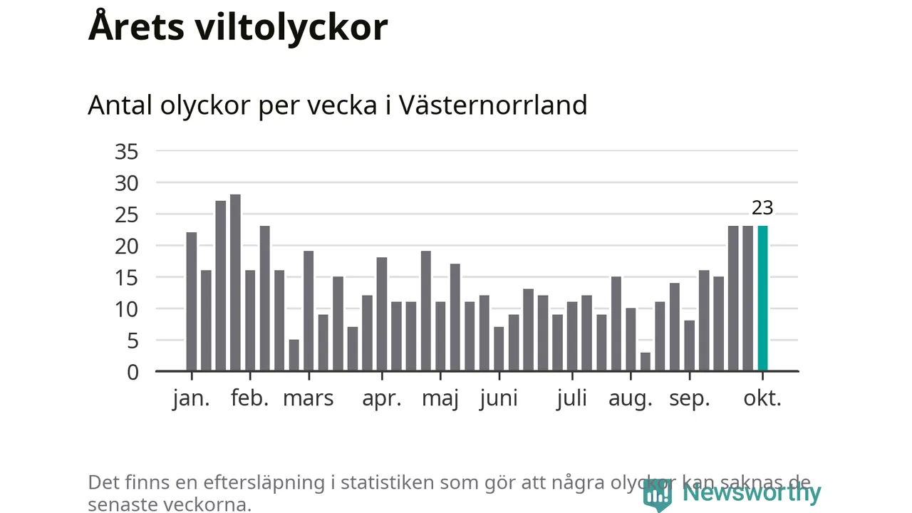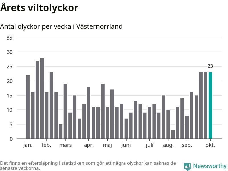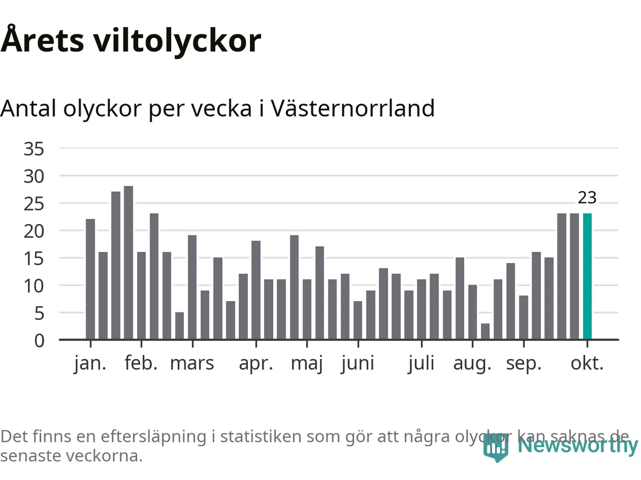 Hittills har 23 viltolyckor rapporterats in i Västernorrlands län från vecka 41. Se listan här.
