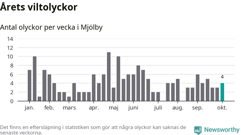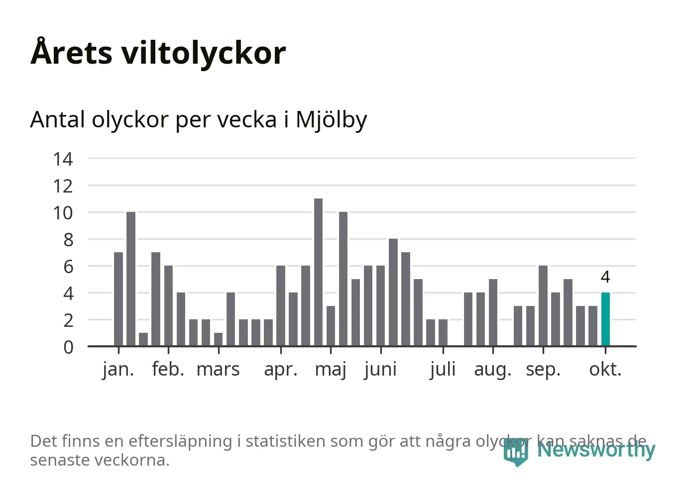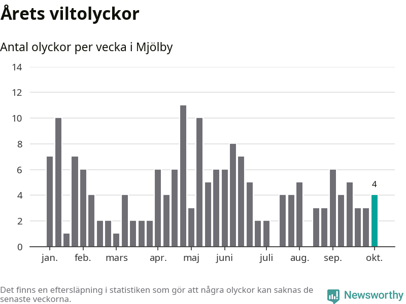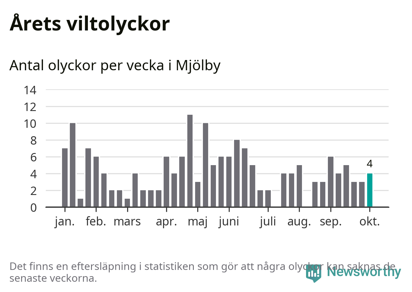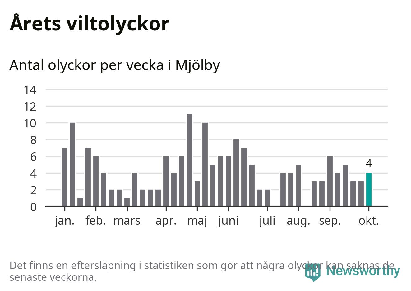 Hittills har fyra viltolyckor rapporterats in i Mjölby kommun från vecka 41. Se listan här.