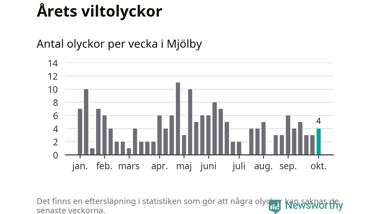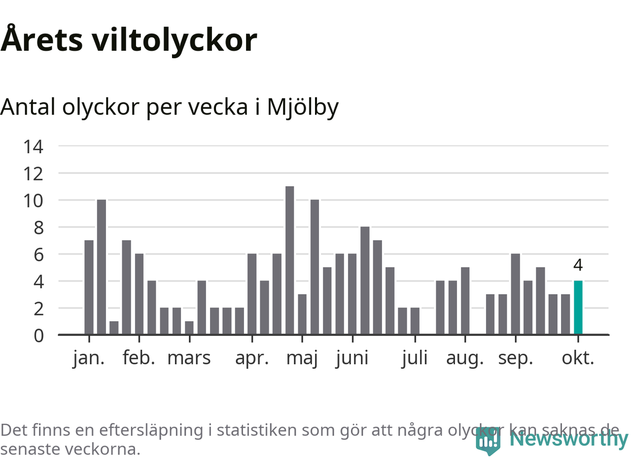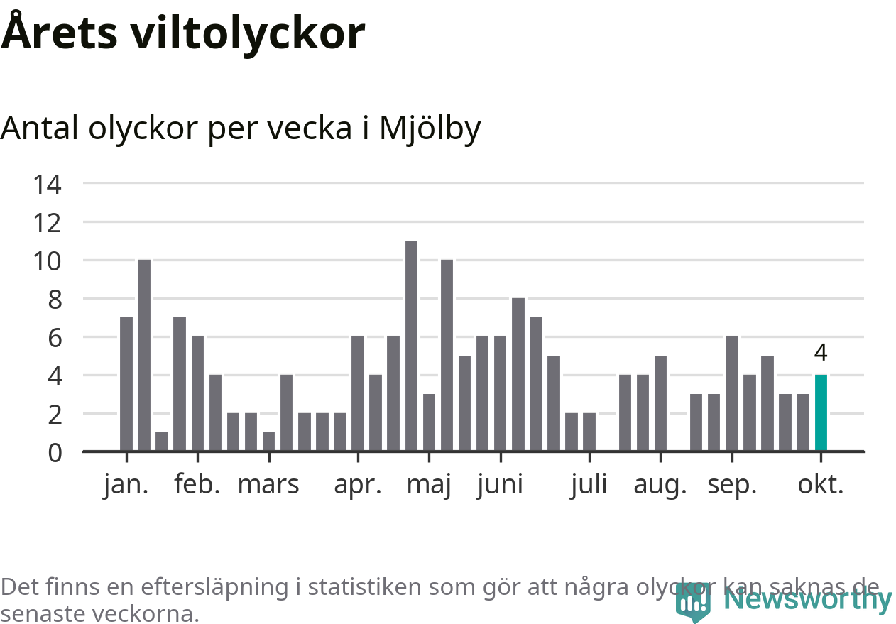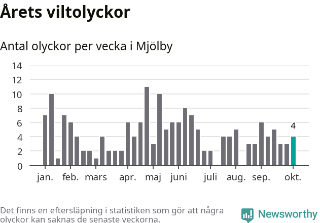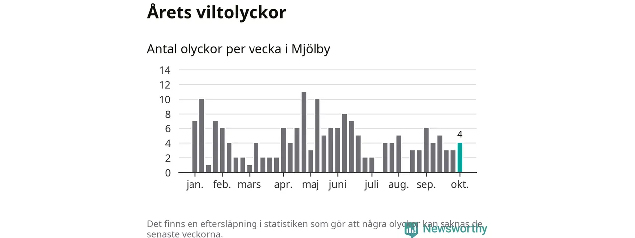Hittills har fyra viltolyckor rapporterats in i Mjölby kommun från vecka 41. Se listan här.
