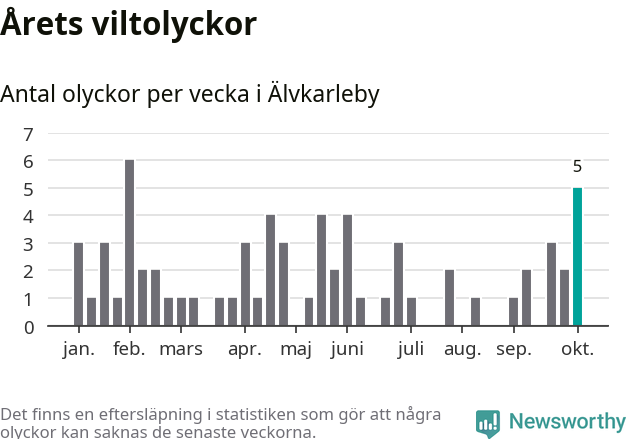 Hittills har fem viltolyckor rapporterats in i Älvkarleby kommun från vecka 41. Se listan här.