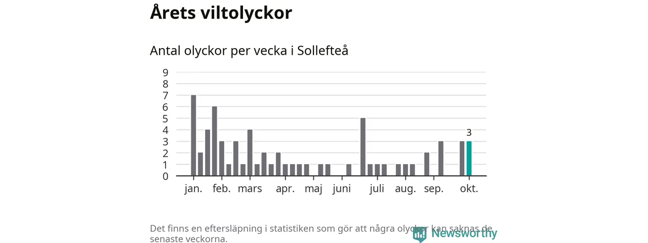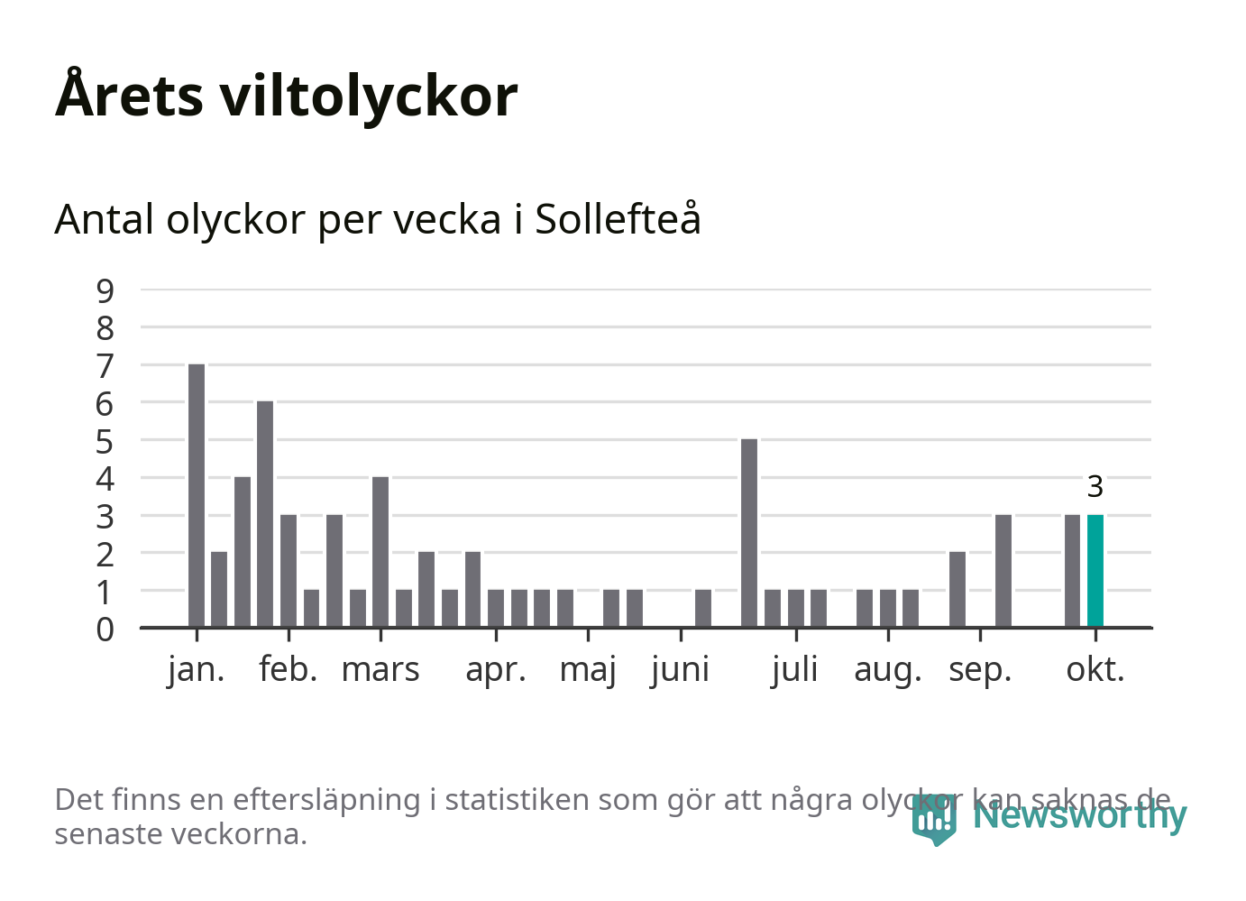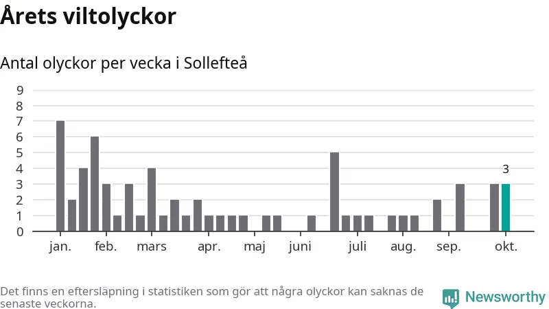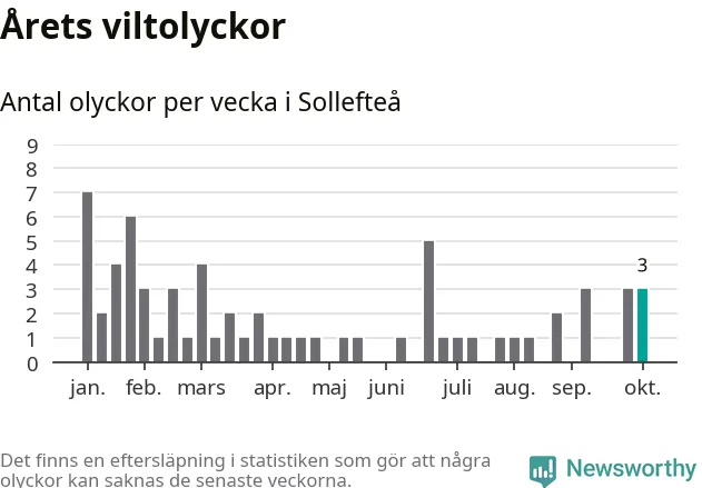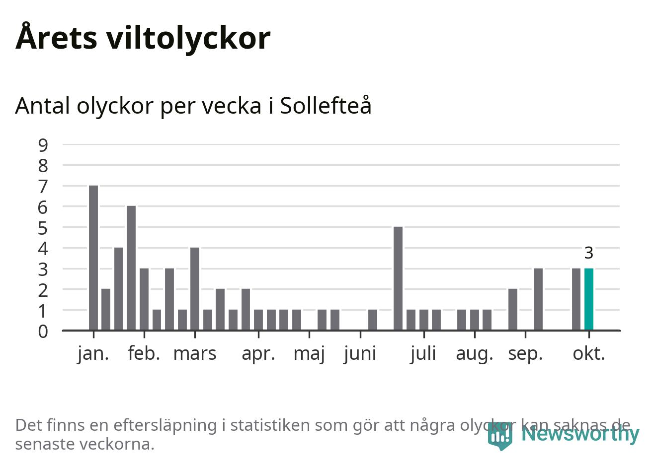 Hittills har tre viltolyckor rapporterats in i Sollefteå kommun från vecka 41. Se listan här.
