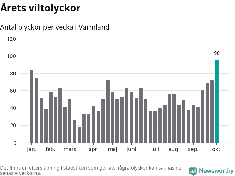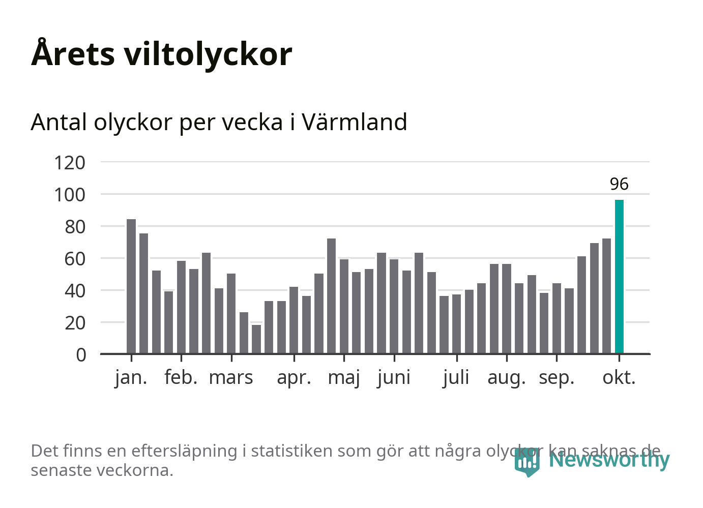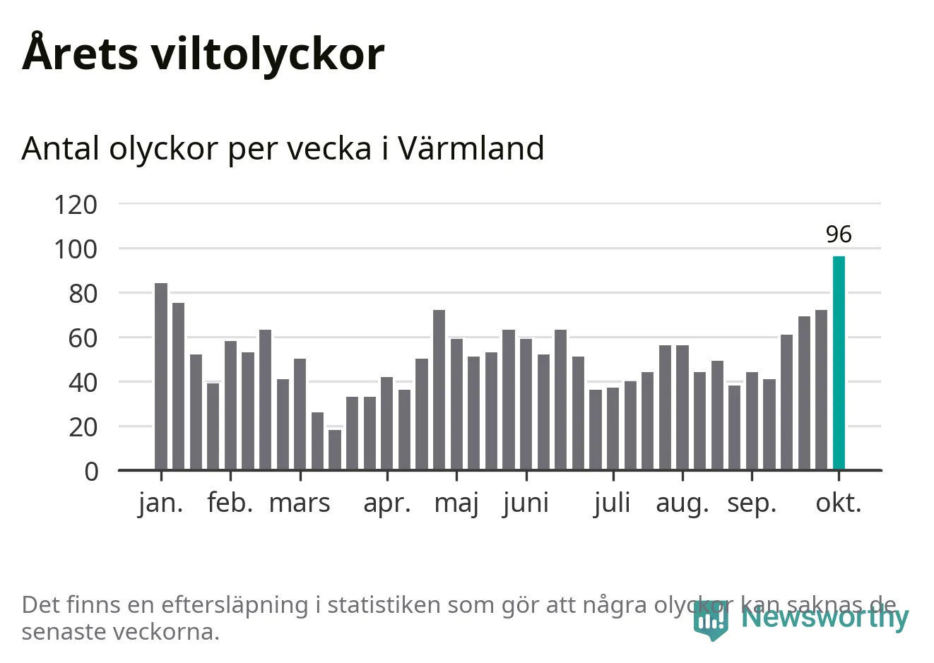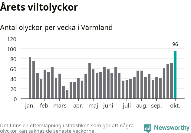 Under vecka 41 rapporterades 96 viltolyckor in i Värmlands län. Det är det största antalet på en enskild vecka hittills i år.