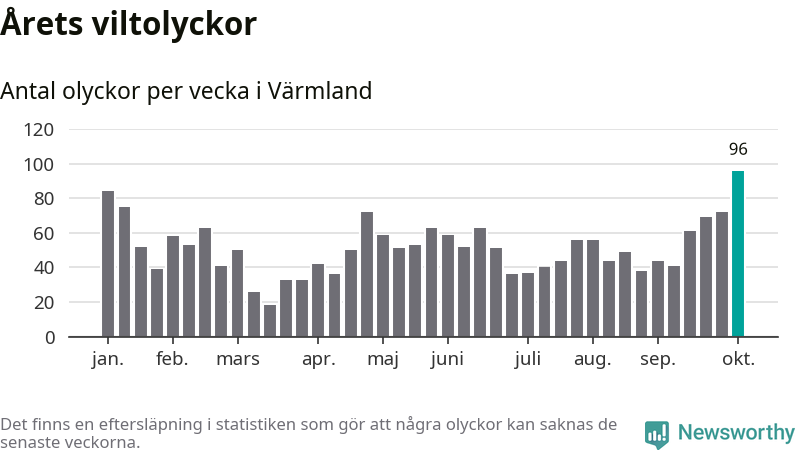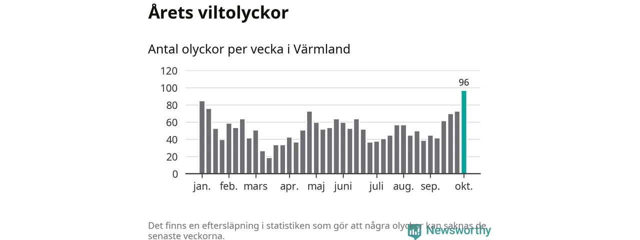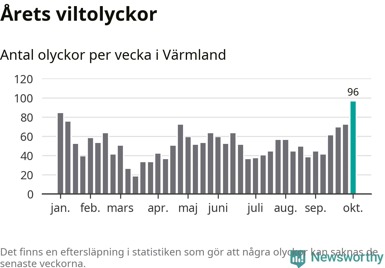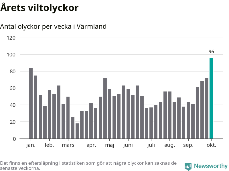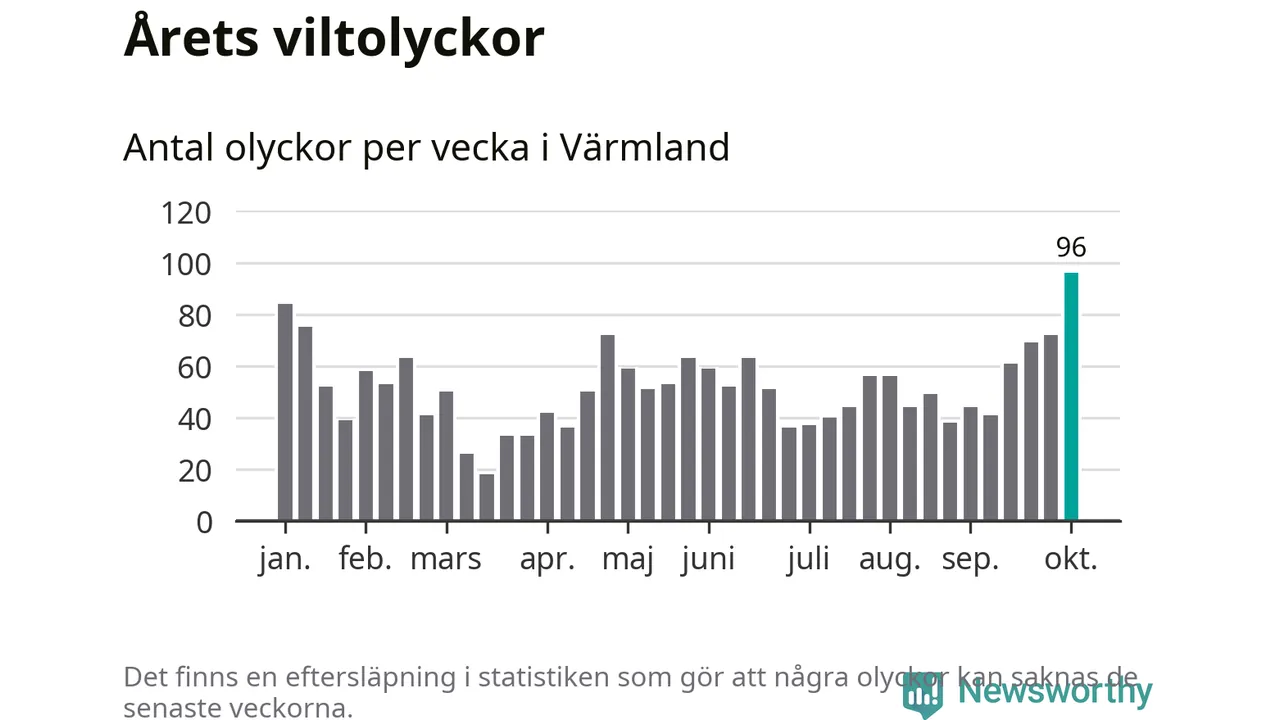 Under vecka 41 rapporterades 96 viltolyckor in i Värmlands län. Det är det största antalet på en enskild vecka hittills i år.