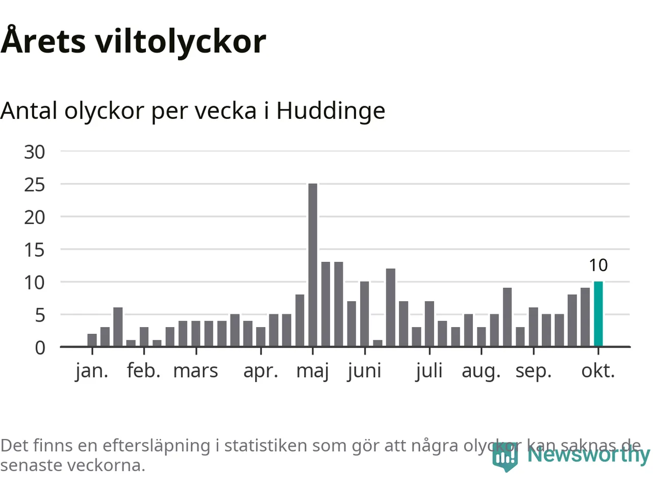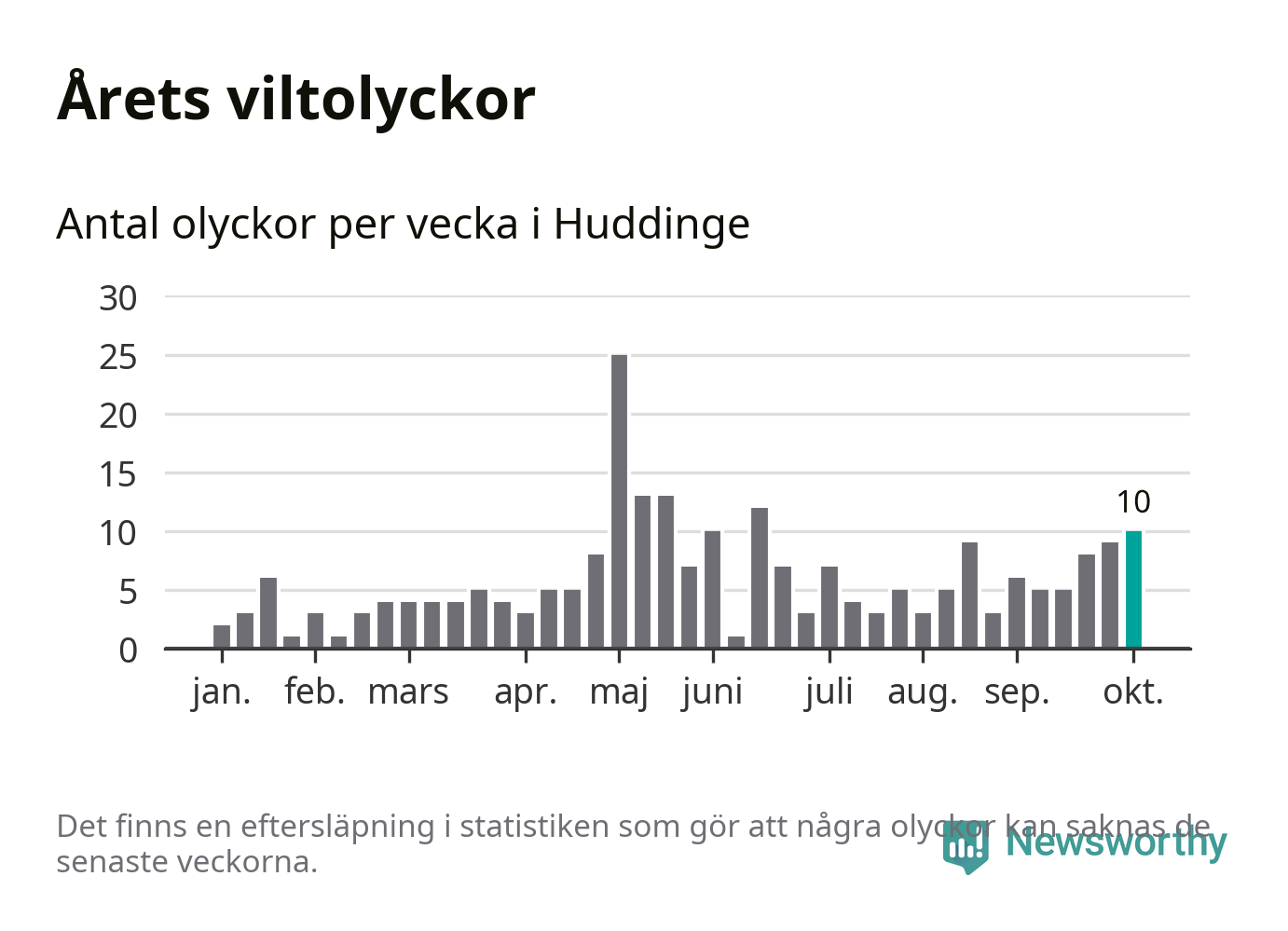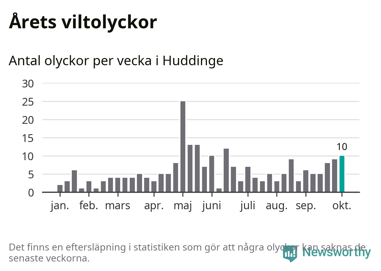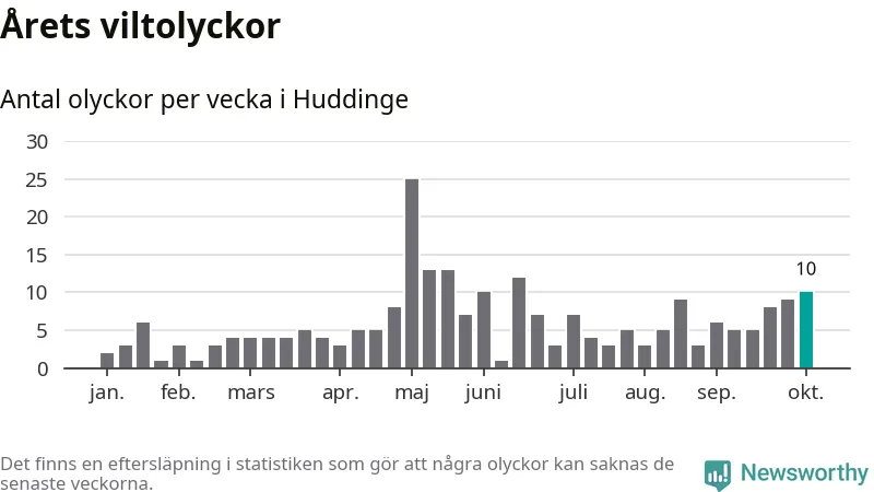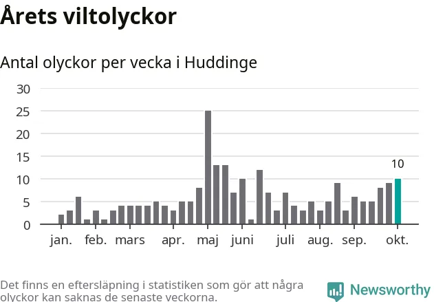 Hittills har tio viltolyckor rapporterats in i Huddinge kommun från vecka 41. Det är en av de högsta höstsiffrorna för en enskild vecka på över tio år.