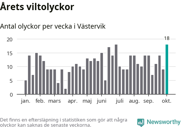 Hittills har 18 viltolyckor rapporterats in i Västerviks kommun från vecka 41. Se listan här.
