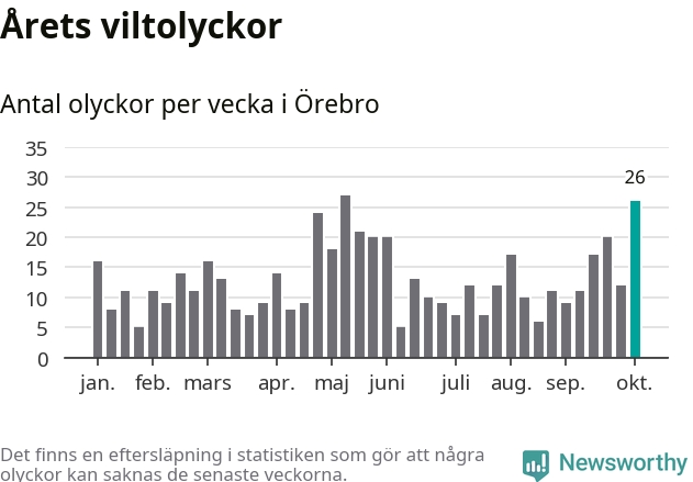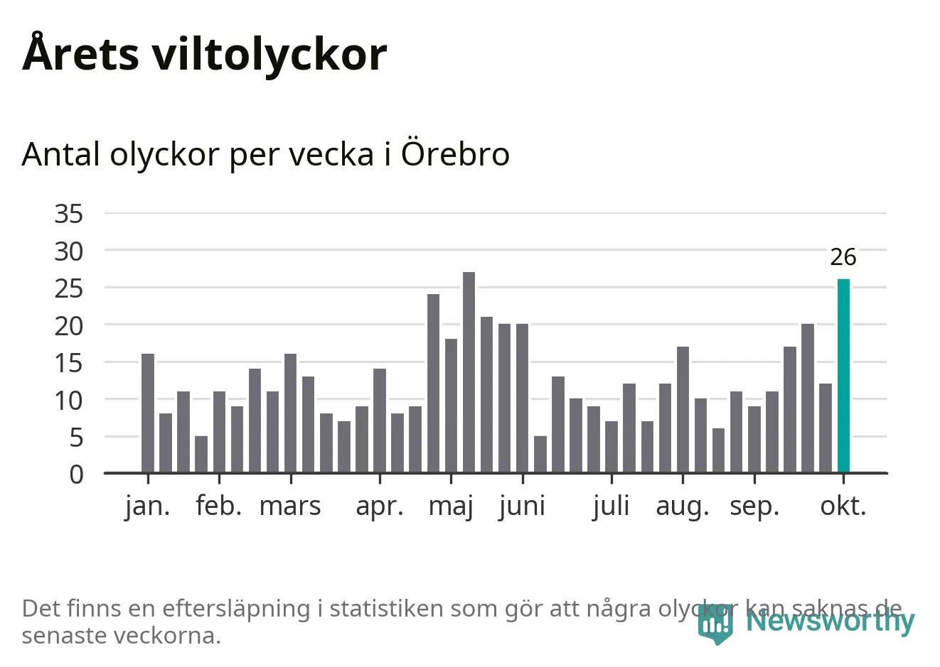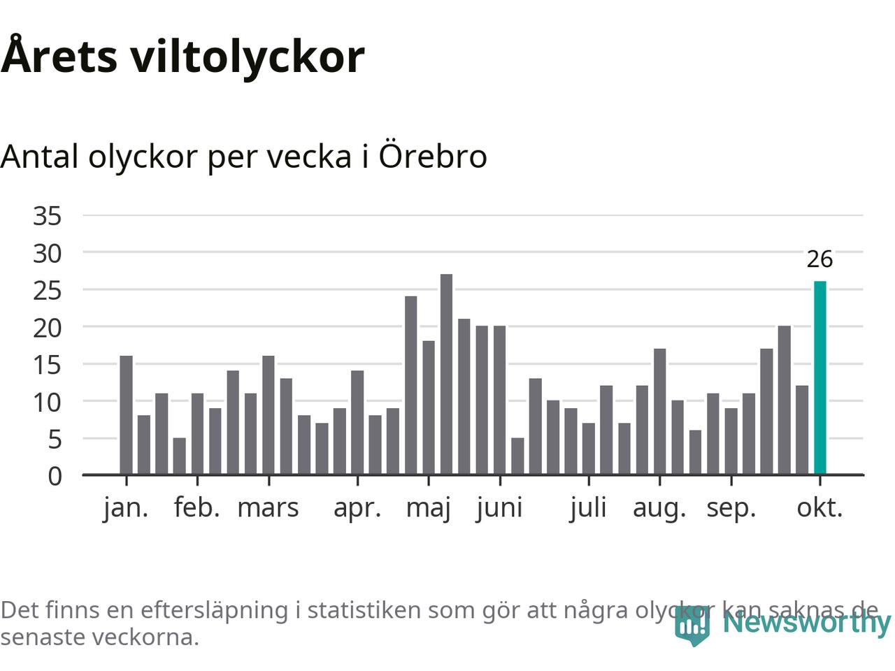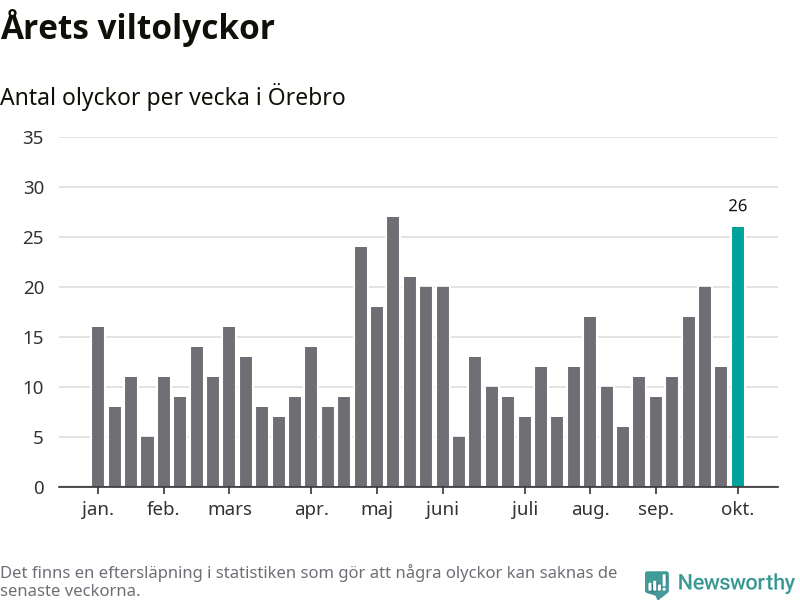 26 olyckor på en enda vecka är däremot ovanligt många. Bara 20 gånger tidigare sedan 2015 har det skett så många viltolyckor på en vecka i Örebro kommun.