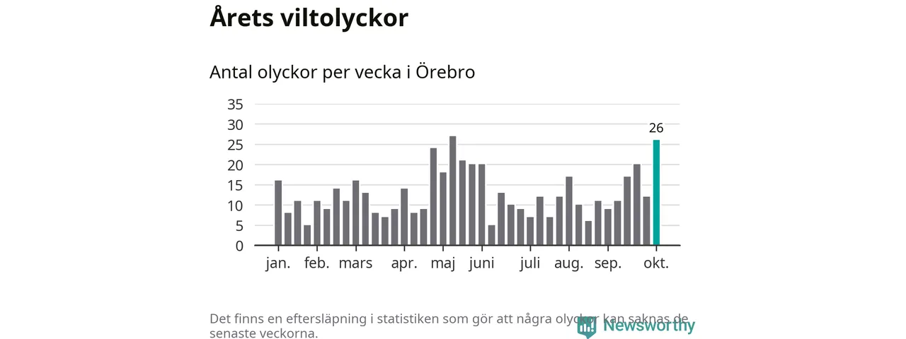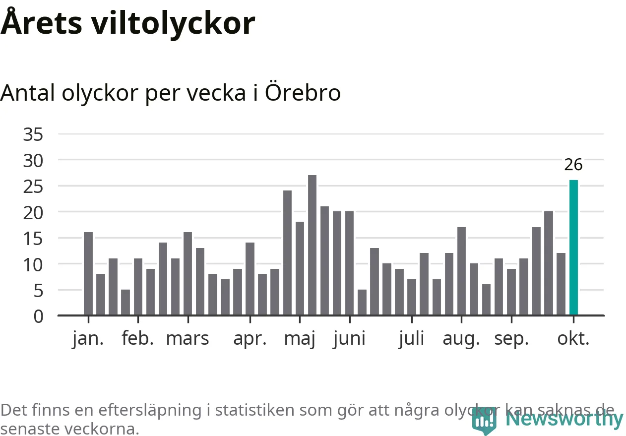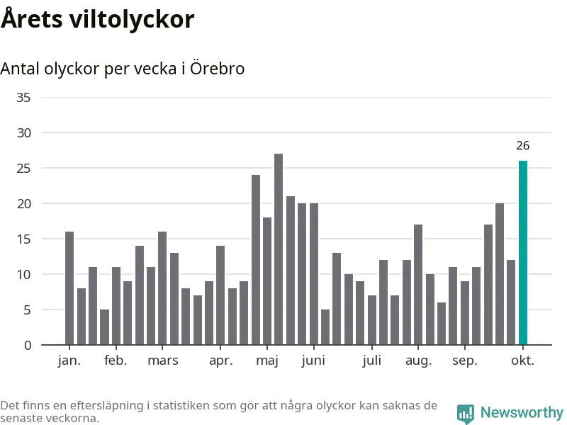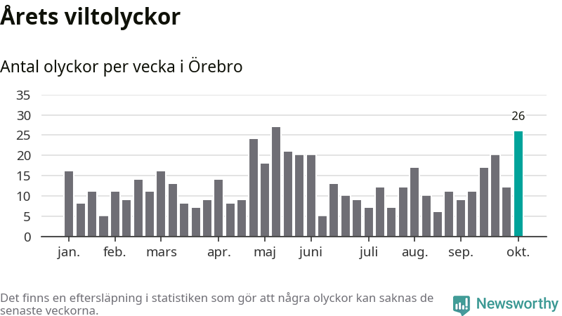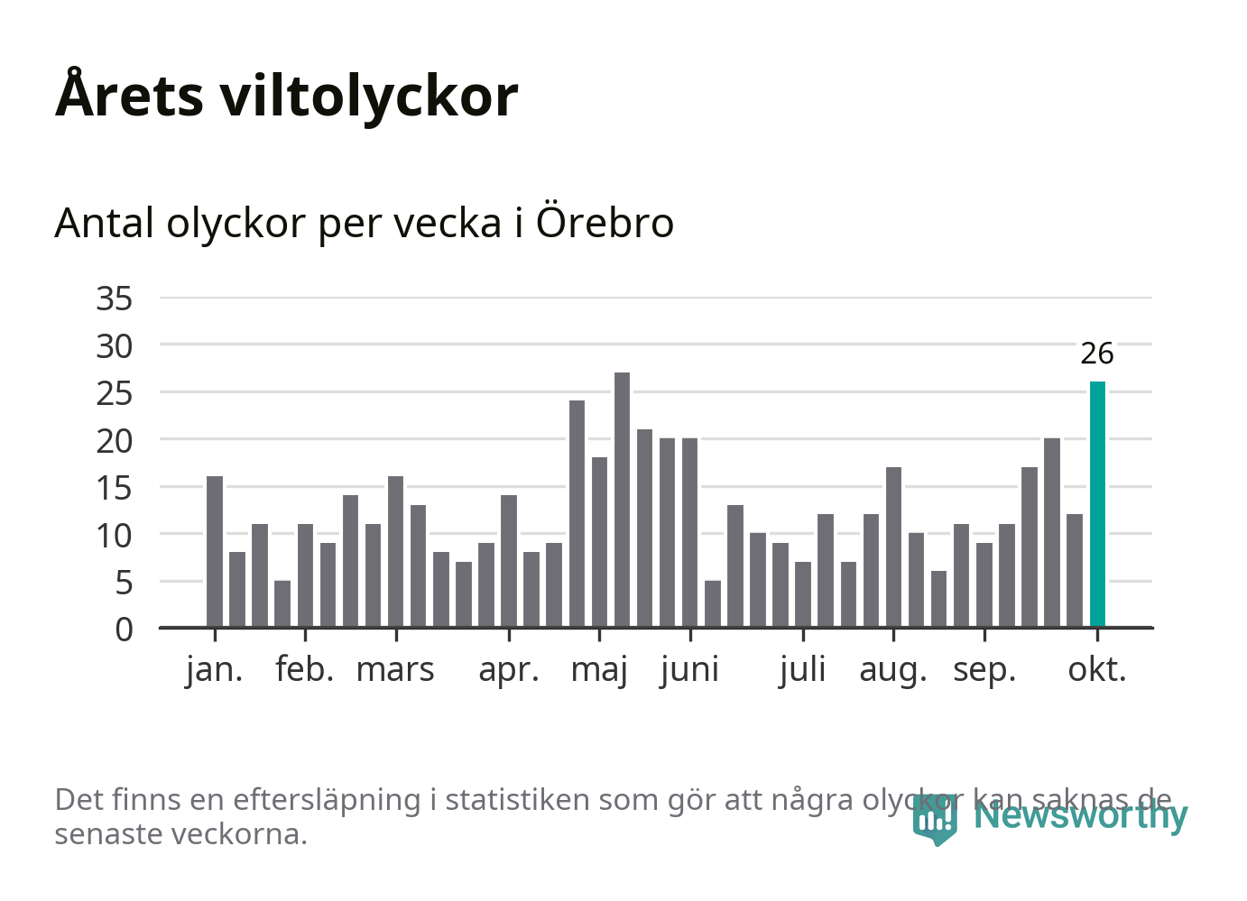 26 olyckor på en enda vecka är däremot ovanligt många. Bara 20 gånger tidigare sedan 2015 har det skett så många viltolyckor på en vecka i Örebro kommun.