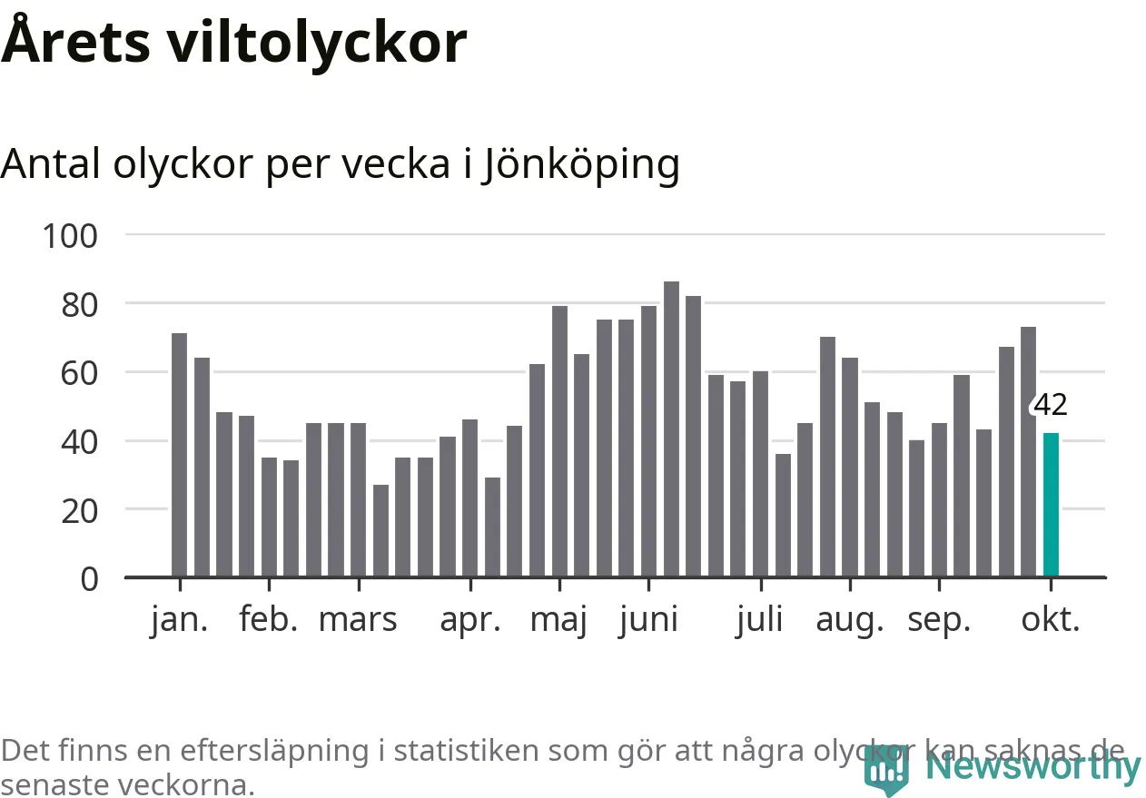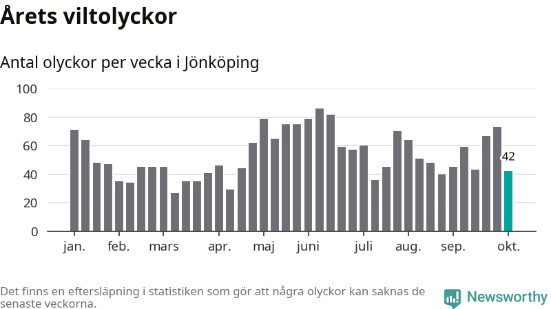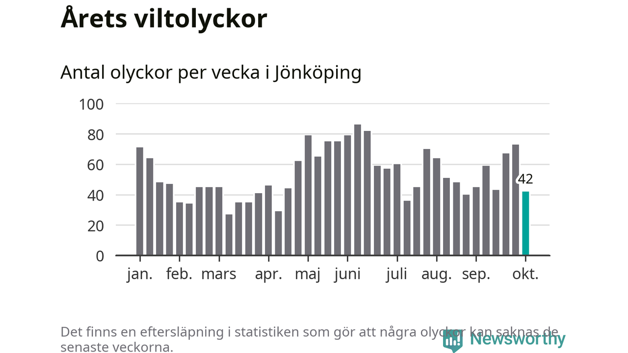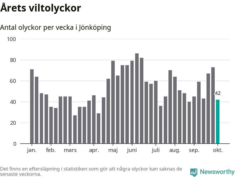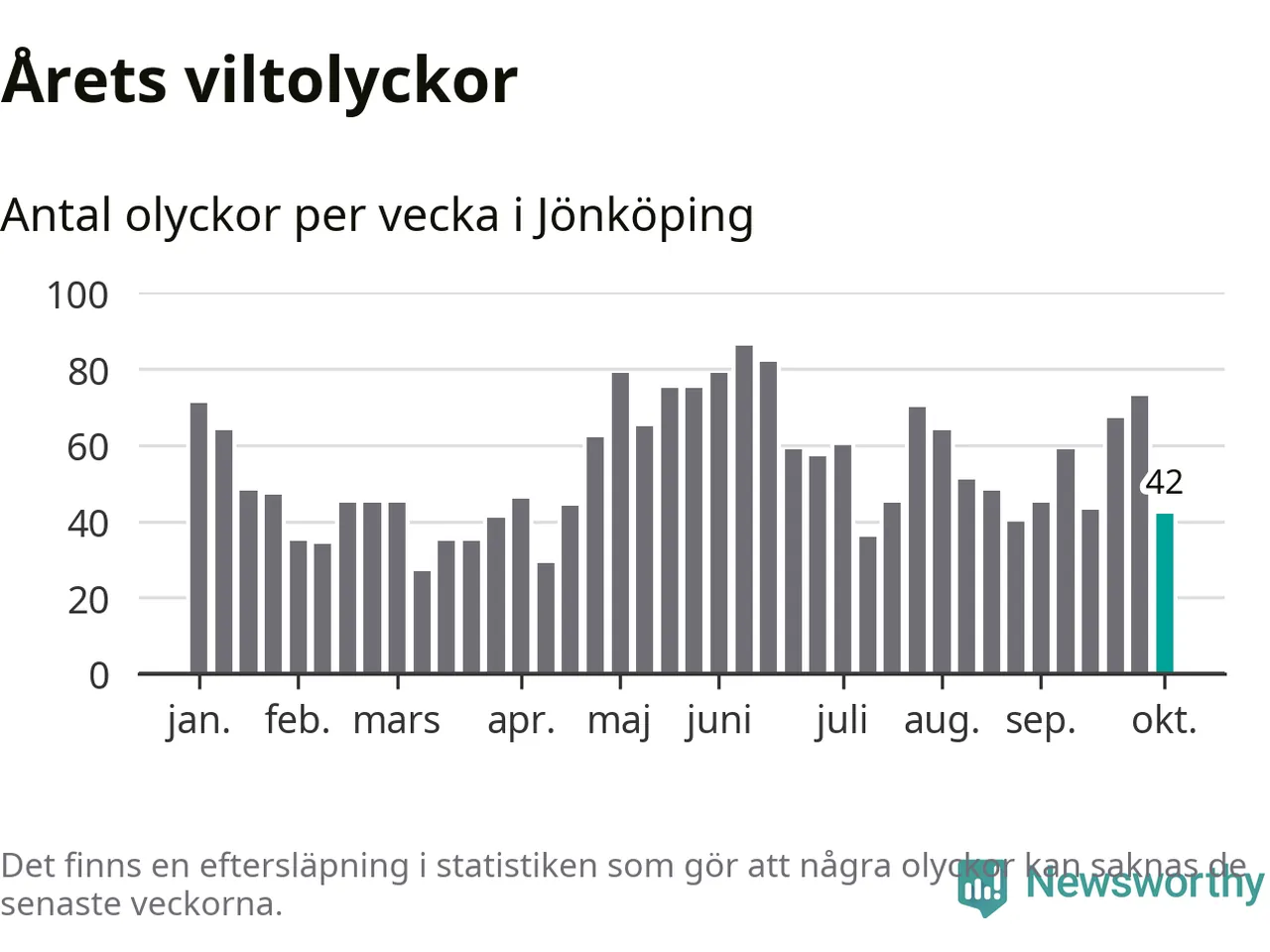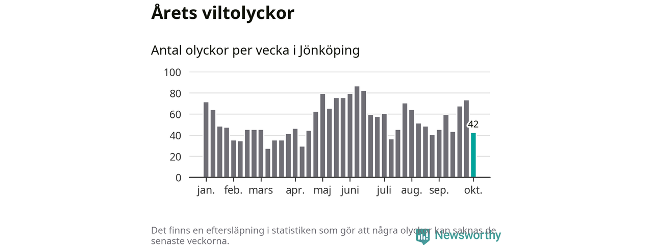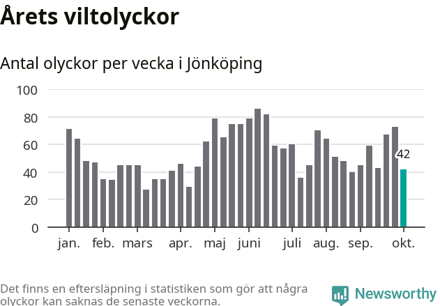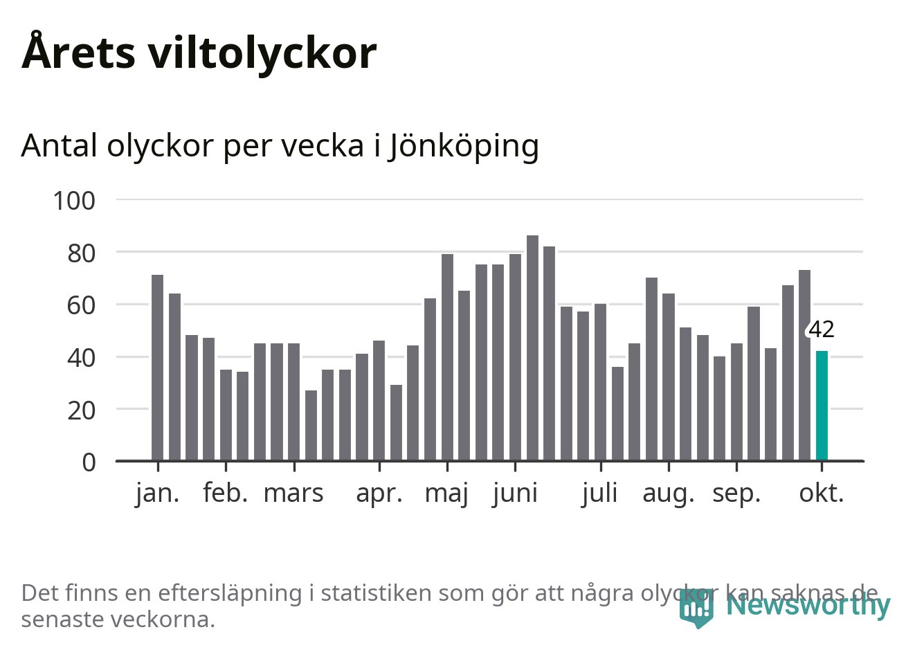 Hittills har 42 viltolyckor rapporterats in i Jönköpings län från vecka 41. Se listan här.