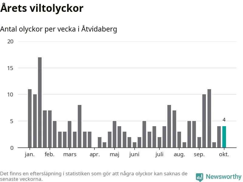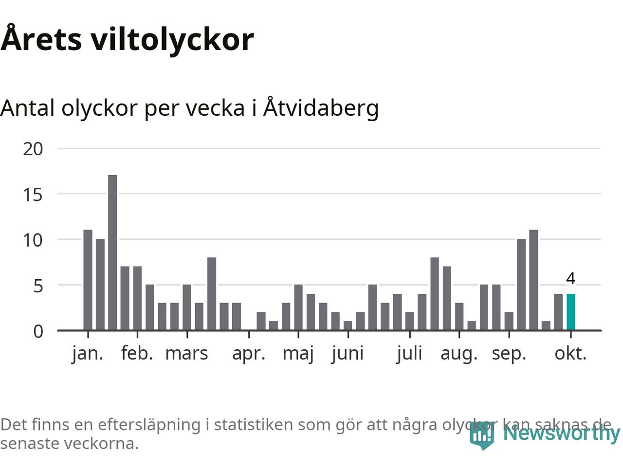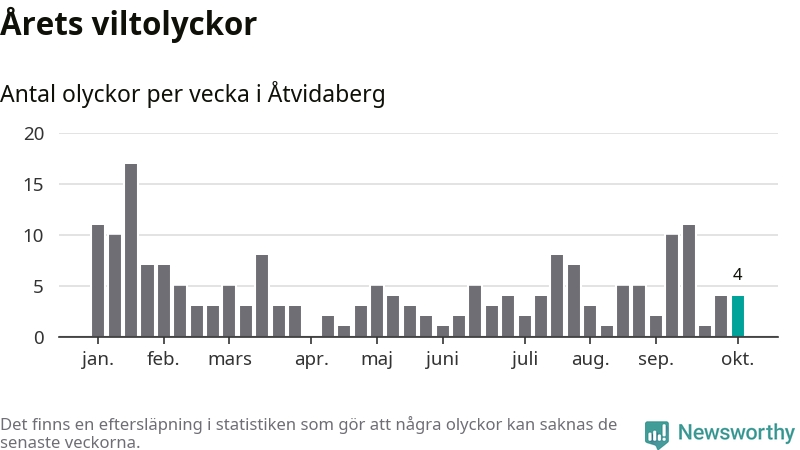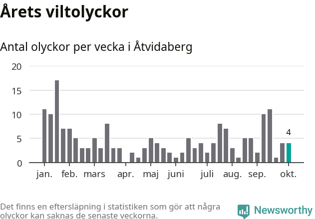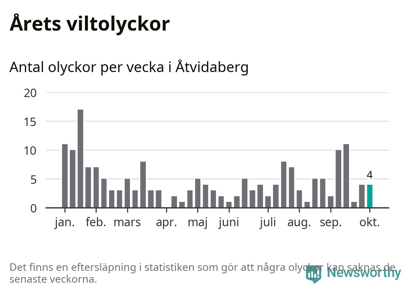 Hittills har fyra viltolyckor rapporterats in i Åtvidabergs kommun från vecka 41. Se listan här.