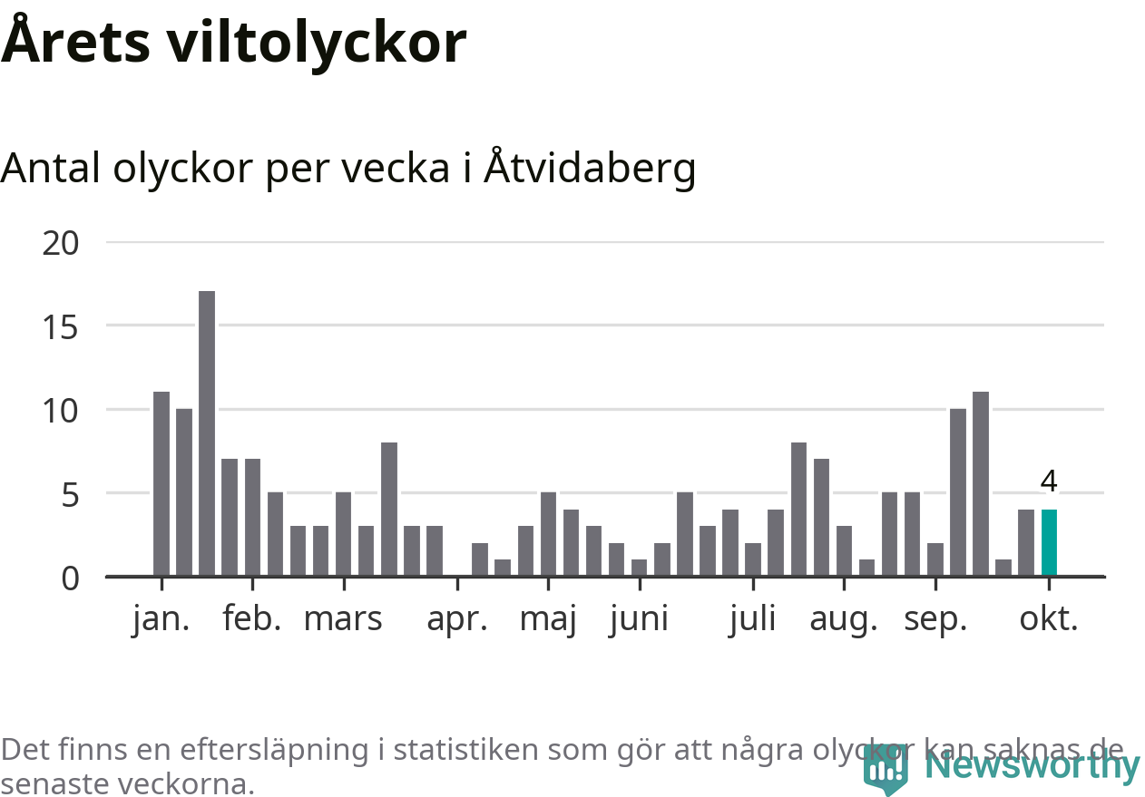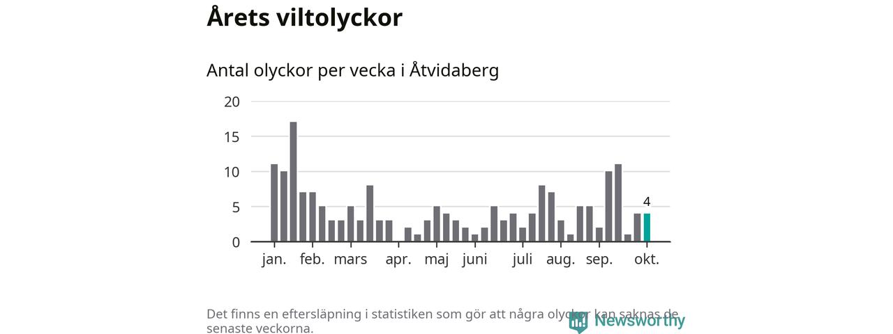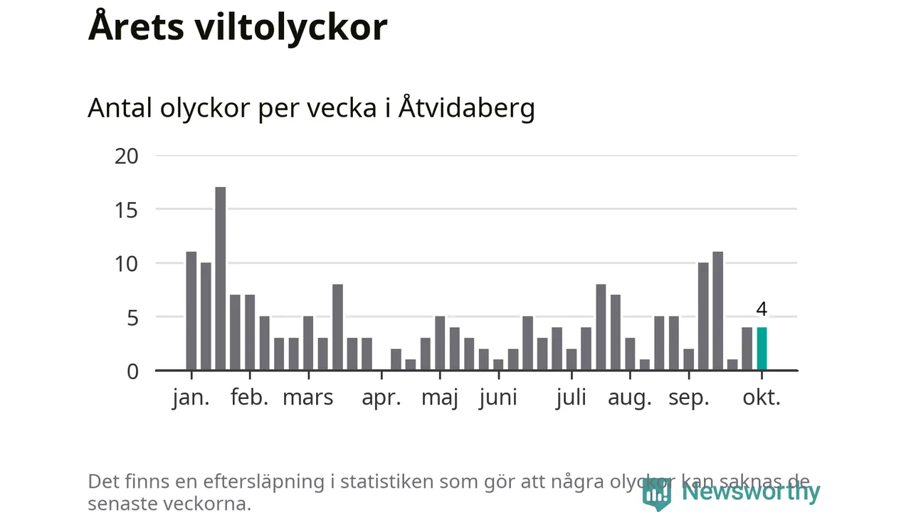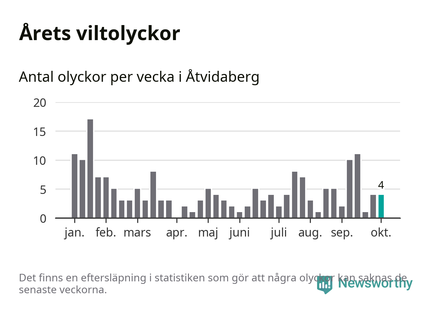 Hittills har fyra viltolyckor rapporterats in i Åtvidabergs kommun från vecka 41. Se listan här.