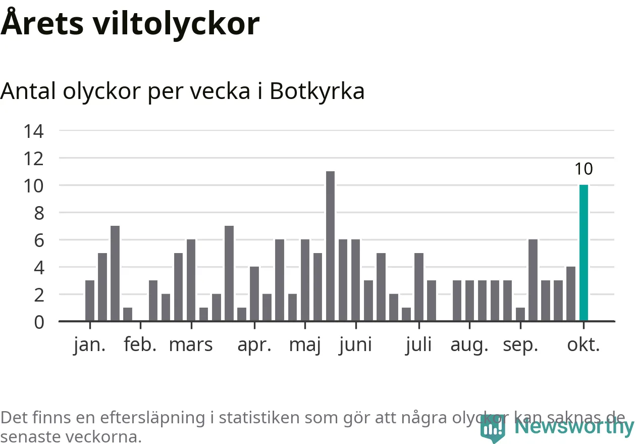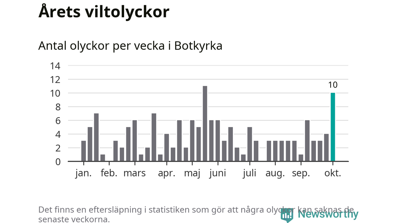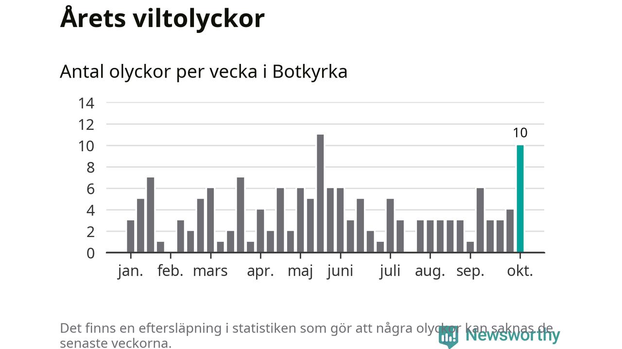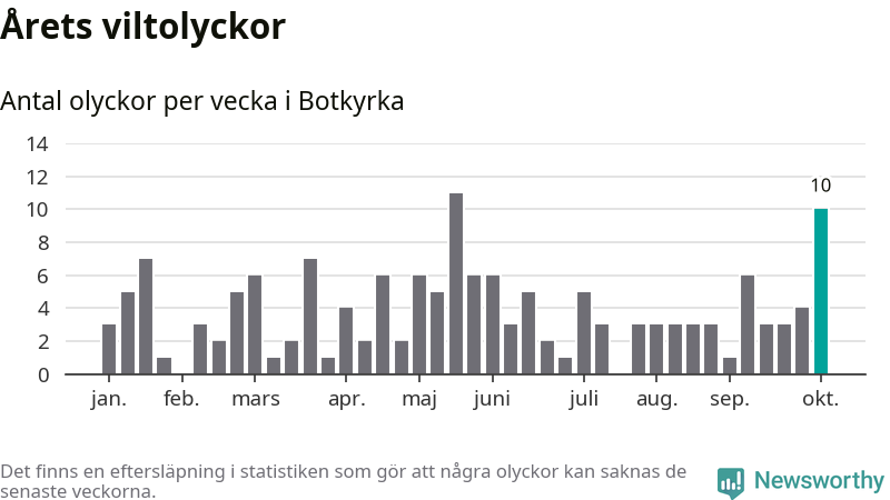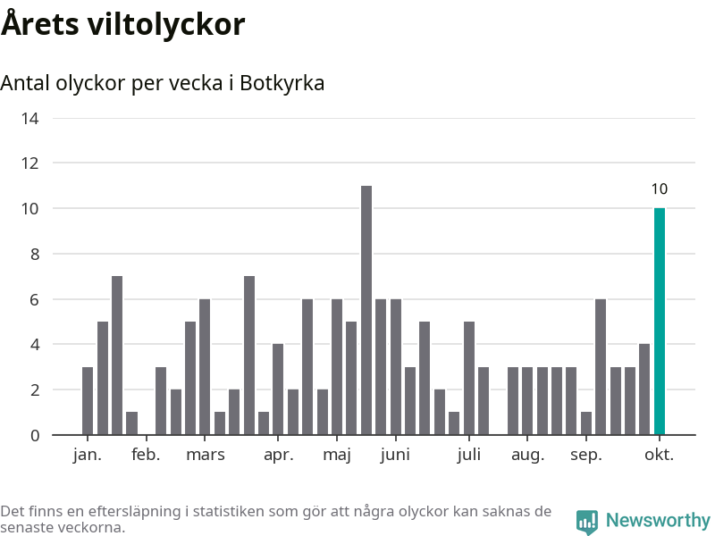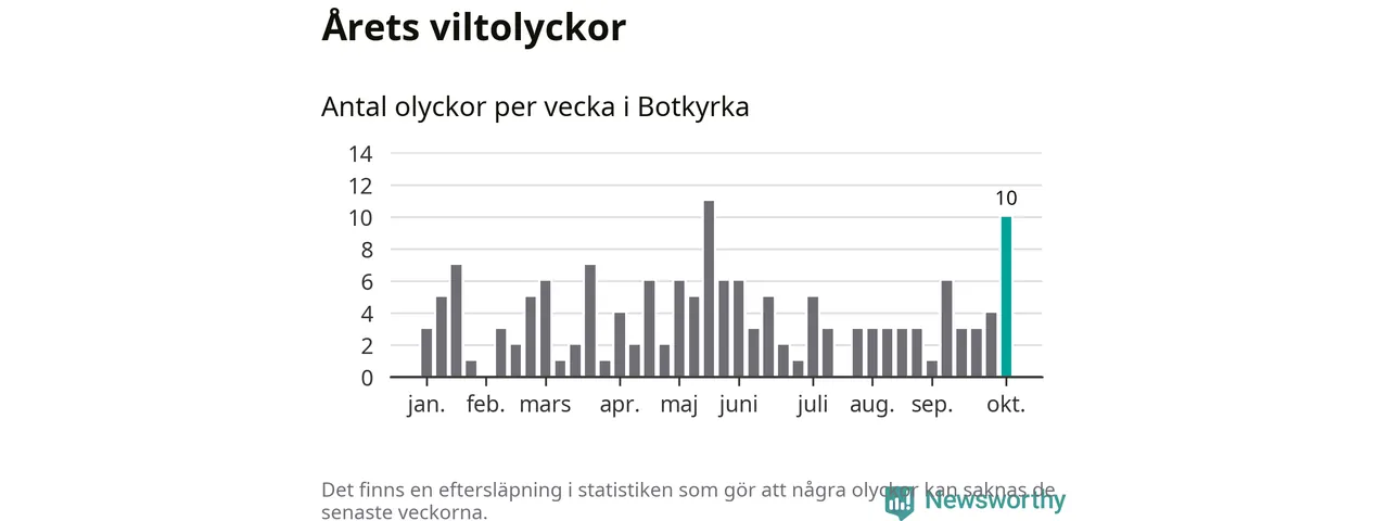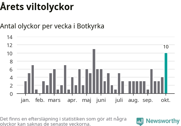 Totalt det här året har det inträffat 152 viltolyckor i kommunen. Det är mer än genomsnittet för motsvarande period (omkring 104) de senaste tio åren.