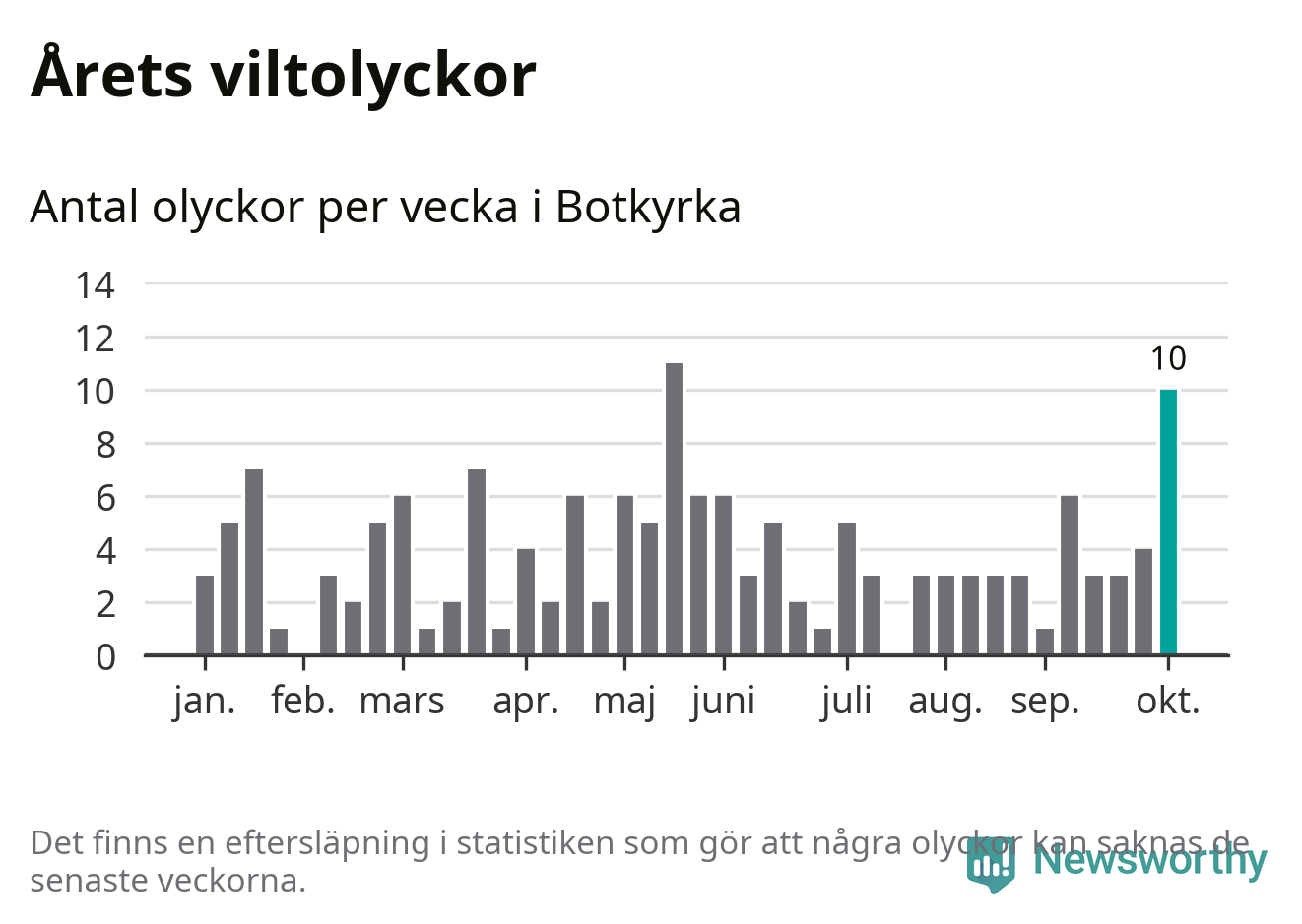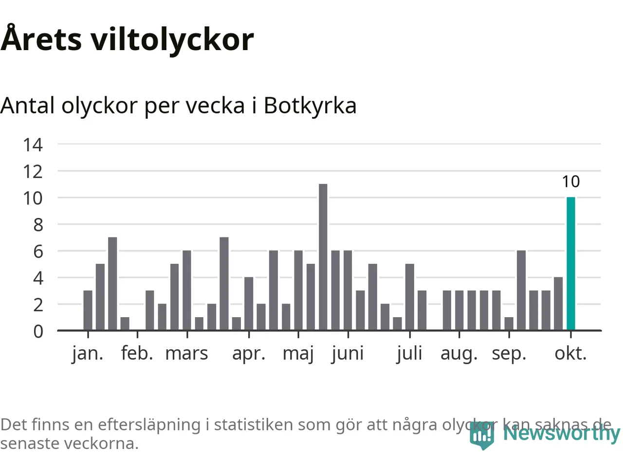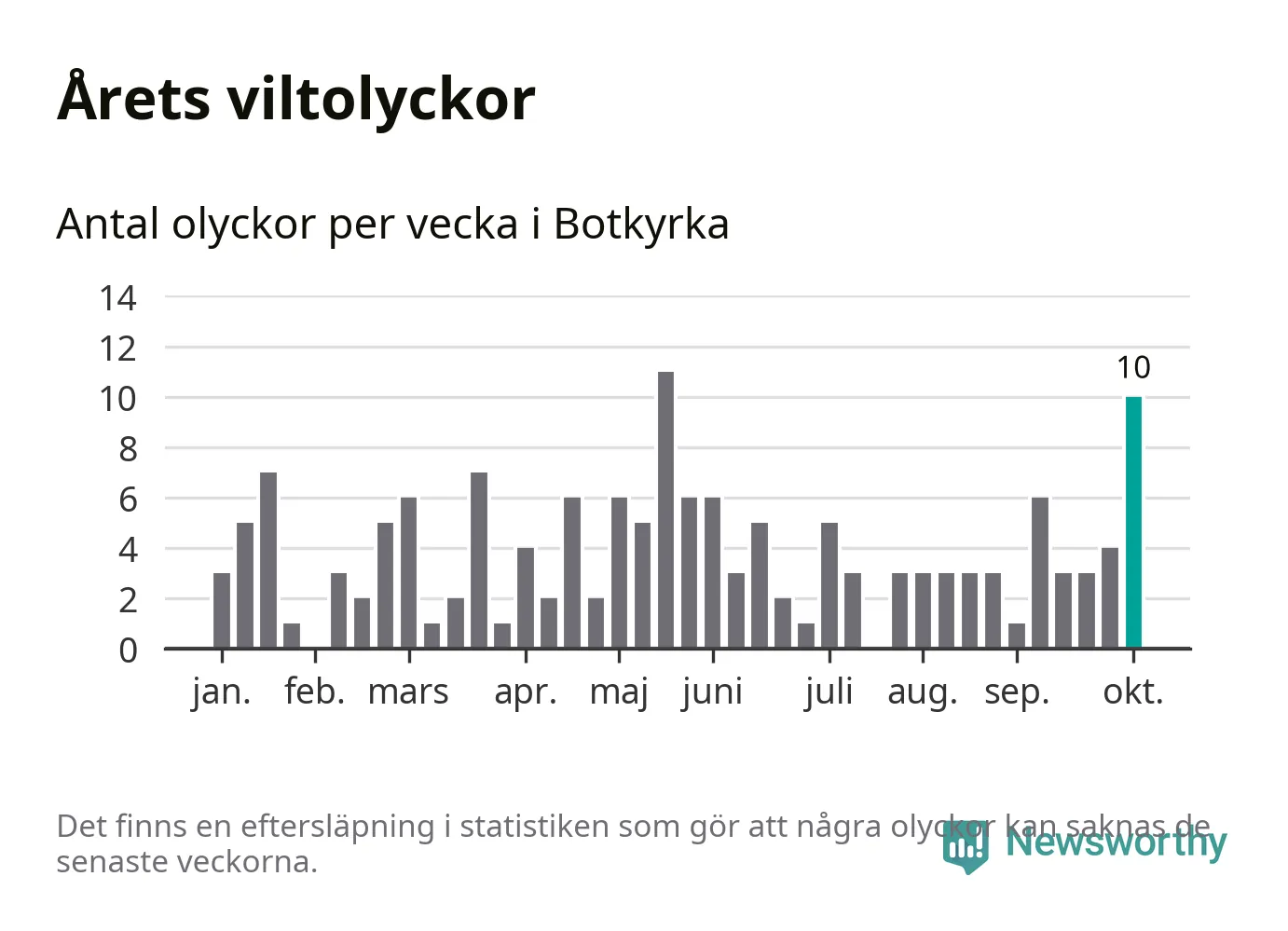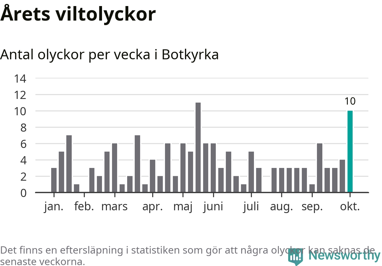 Totalt det här året har det inträffat 152 viltolyckor i kommunen. Det är mer än genomsnittet för motsvarande period (omkring 104) de senaste tio åren.