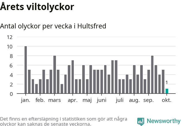 Från förra veckan (vecka 41) har hittills en viltolycka rapporterats in i Hultsfreds kommun.