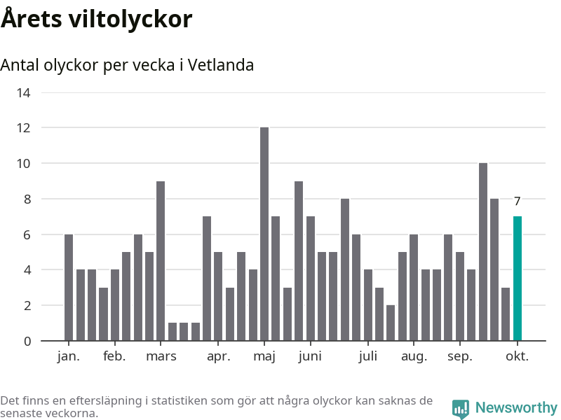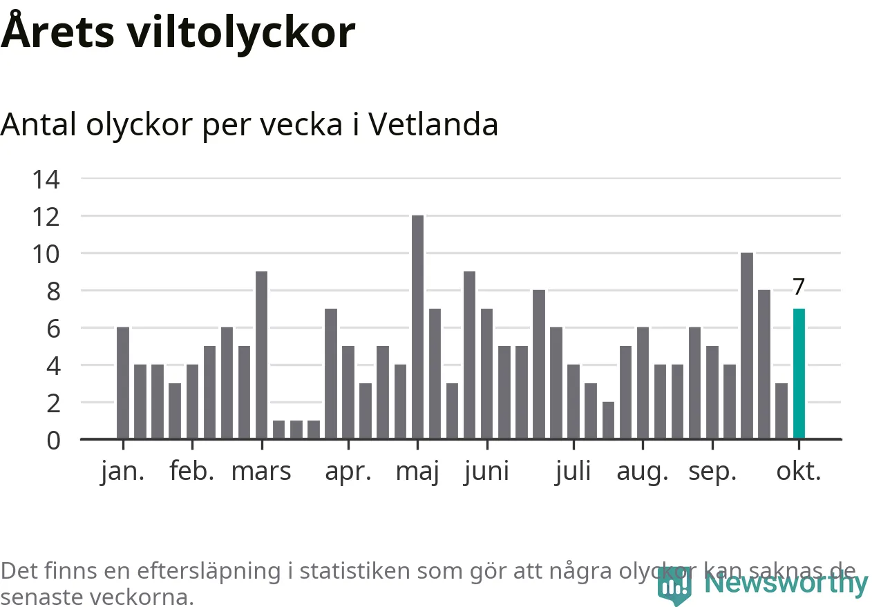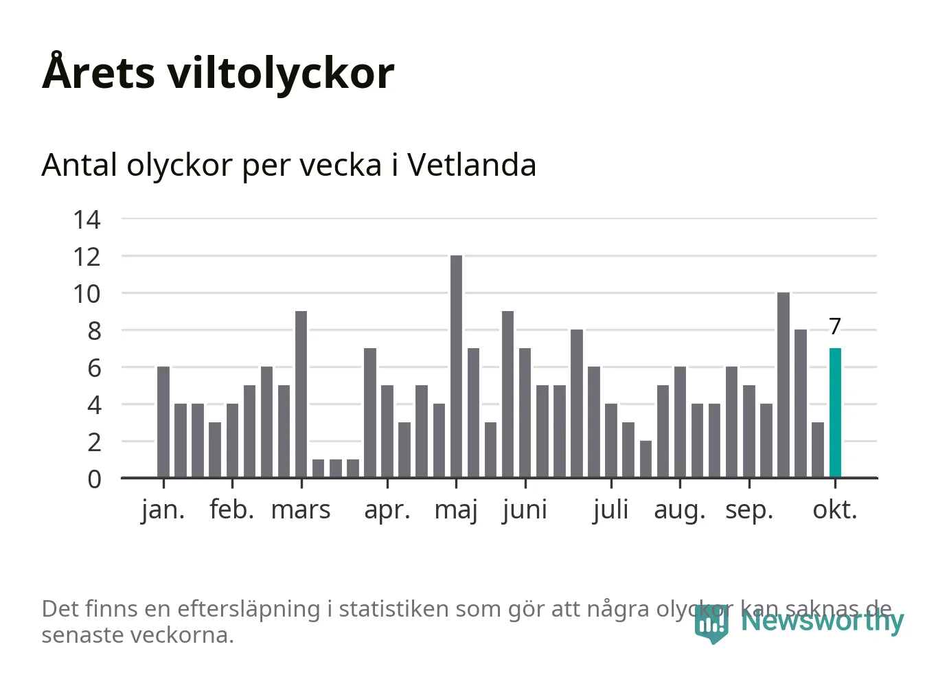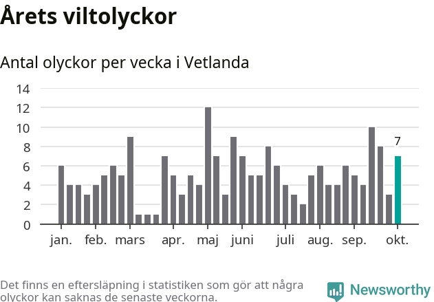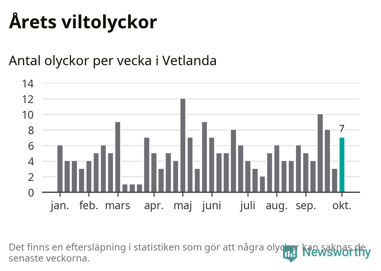Hittills har sju viltolyckor rapporterats in i Vetlanda kommun från vecka 41. Se listan här.