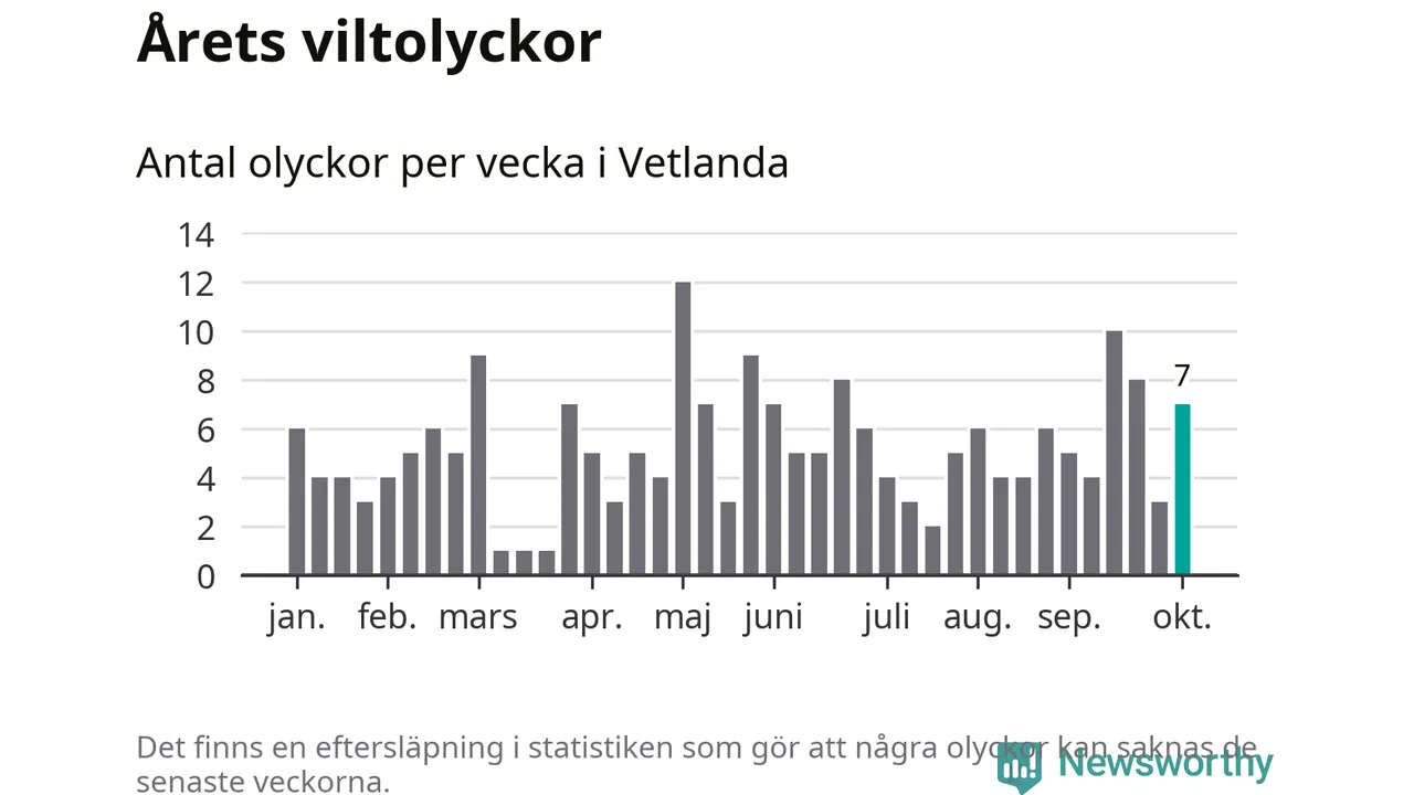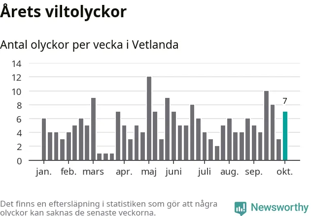 Totalt det här året har det inträffat 212 viltolyckor i kommunen. Det är mindre än genomsnittet för motsvarande period (omkring 273) de senaste tio åren.