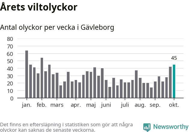 Hittills har 45 viltolyckor rapporterats in i Gävleborgs län från vecka 41. Se listan här.