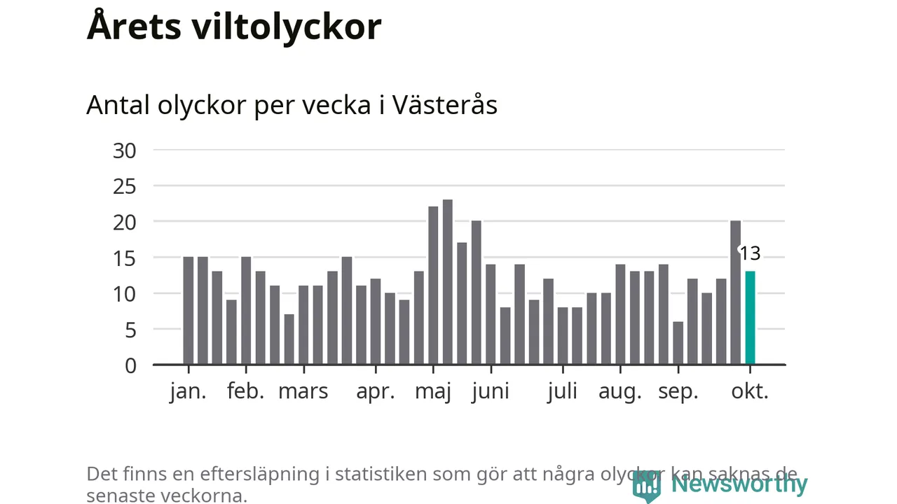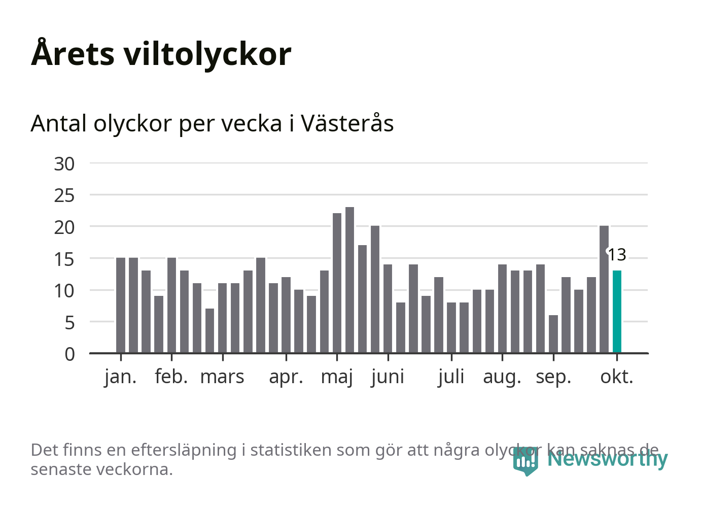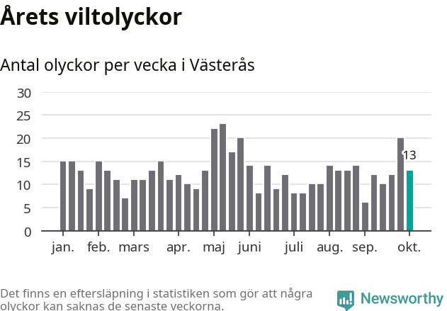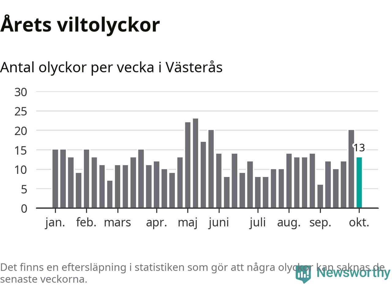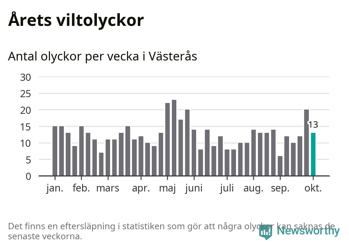 Hittills har 13 viltolyckor rapporterats in i Västerås kommun från vecka 41. Se listan här.