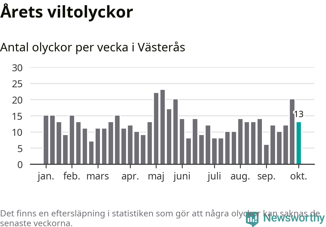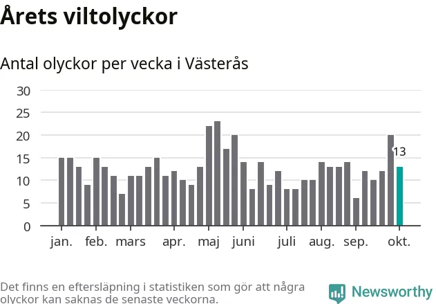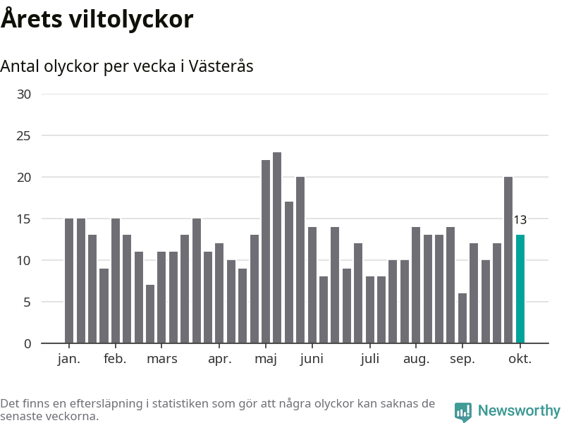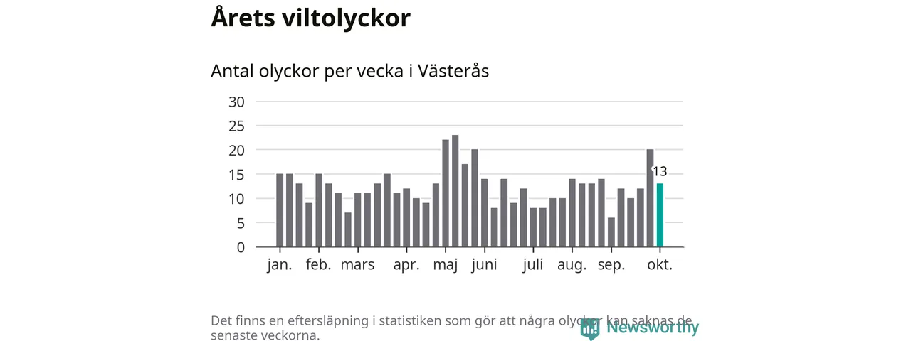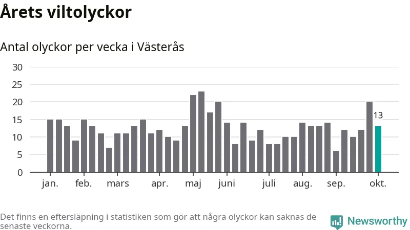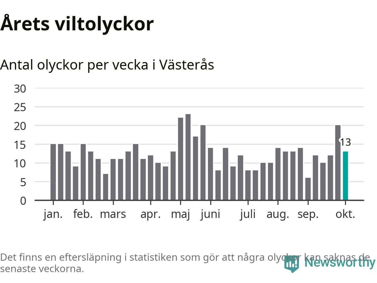 Hittills har 13 viltolyckor rapporterats in i Västerås kommun från vecka 41. Se listan här.