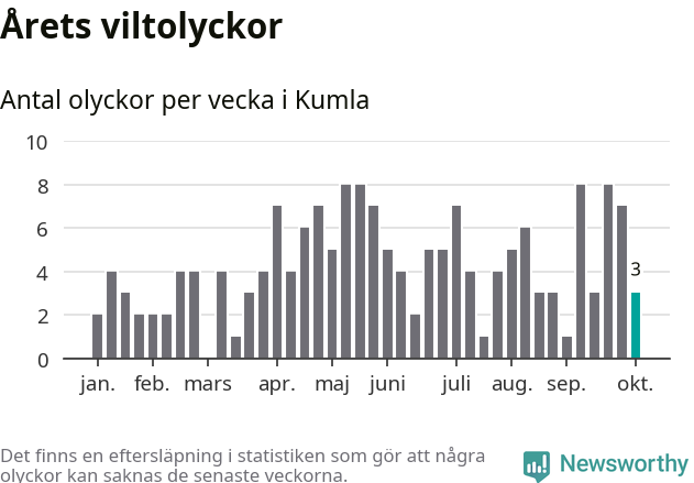 Hittills har tre viltolyckor rapporterats in i Kumla kommun från vecka 41. Se listan här.