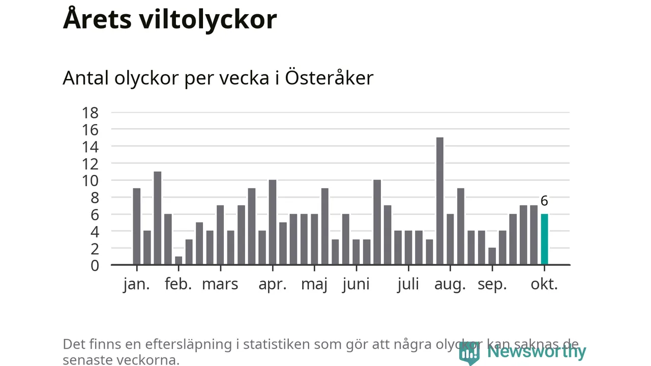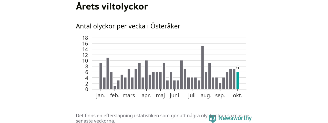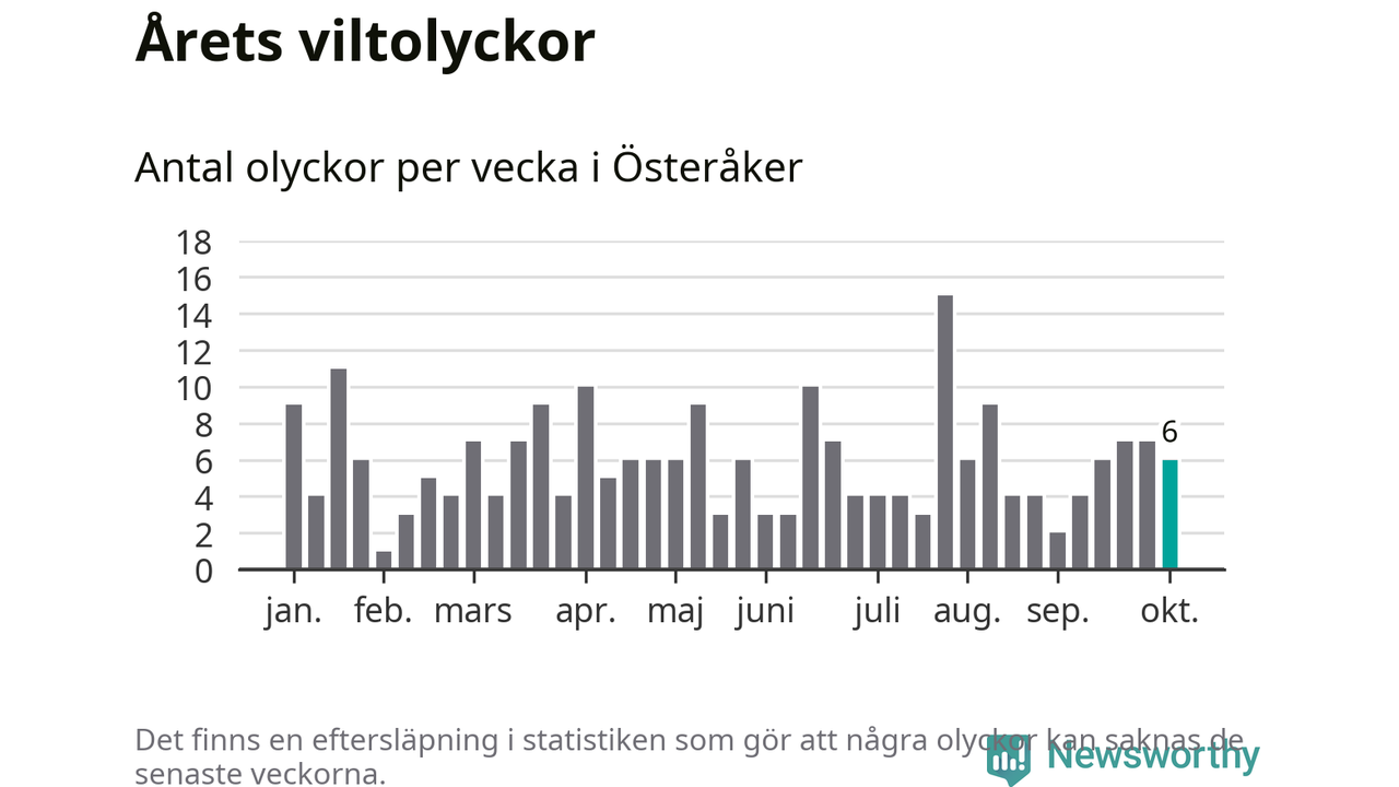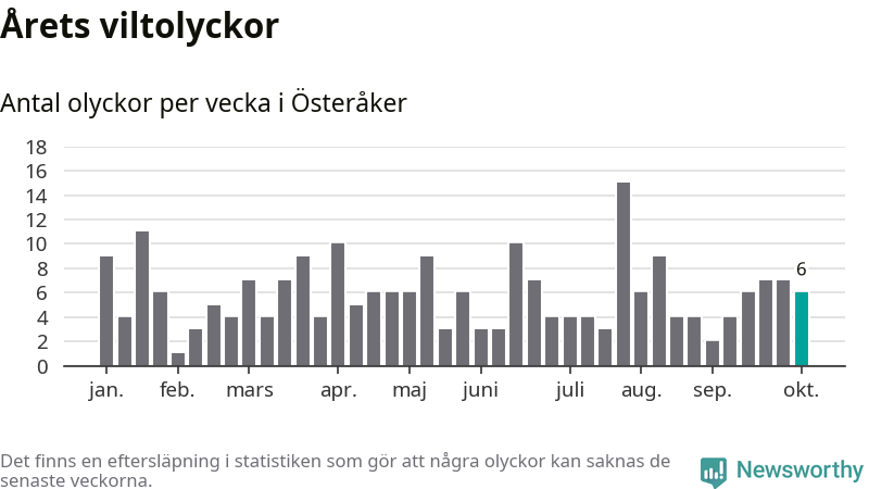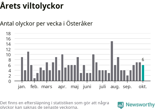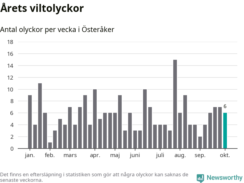 Hittills har sex viltolyckor rapporterats in i Österåkers kommun från vecka 41. Se listan här.