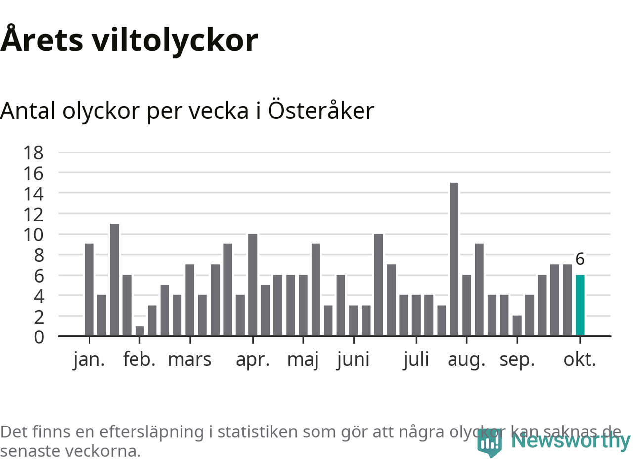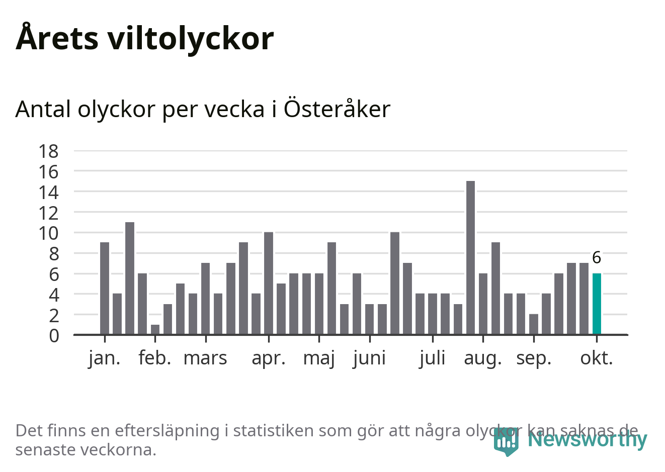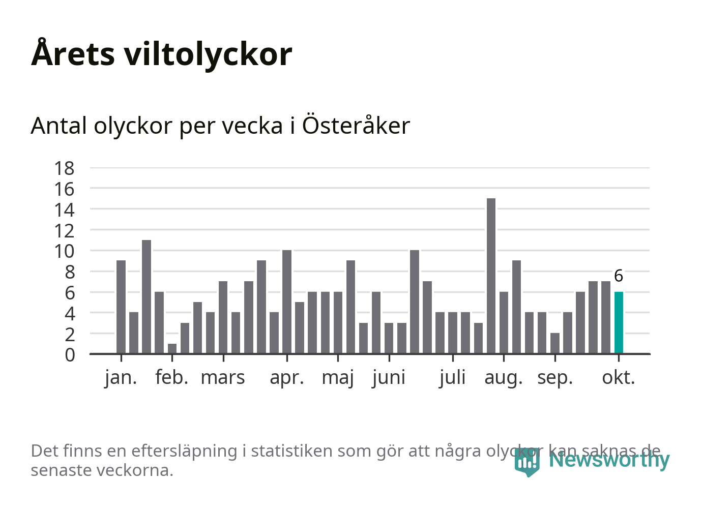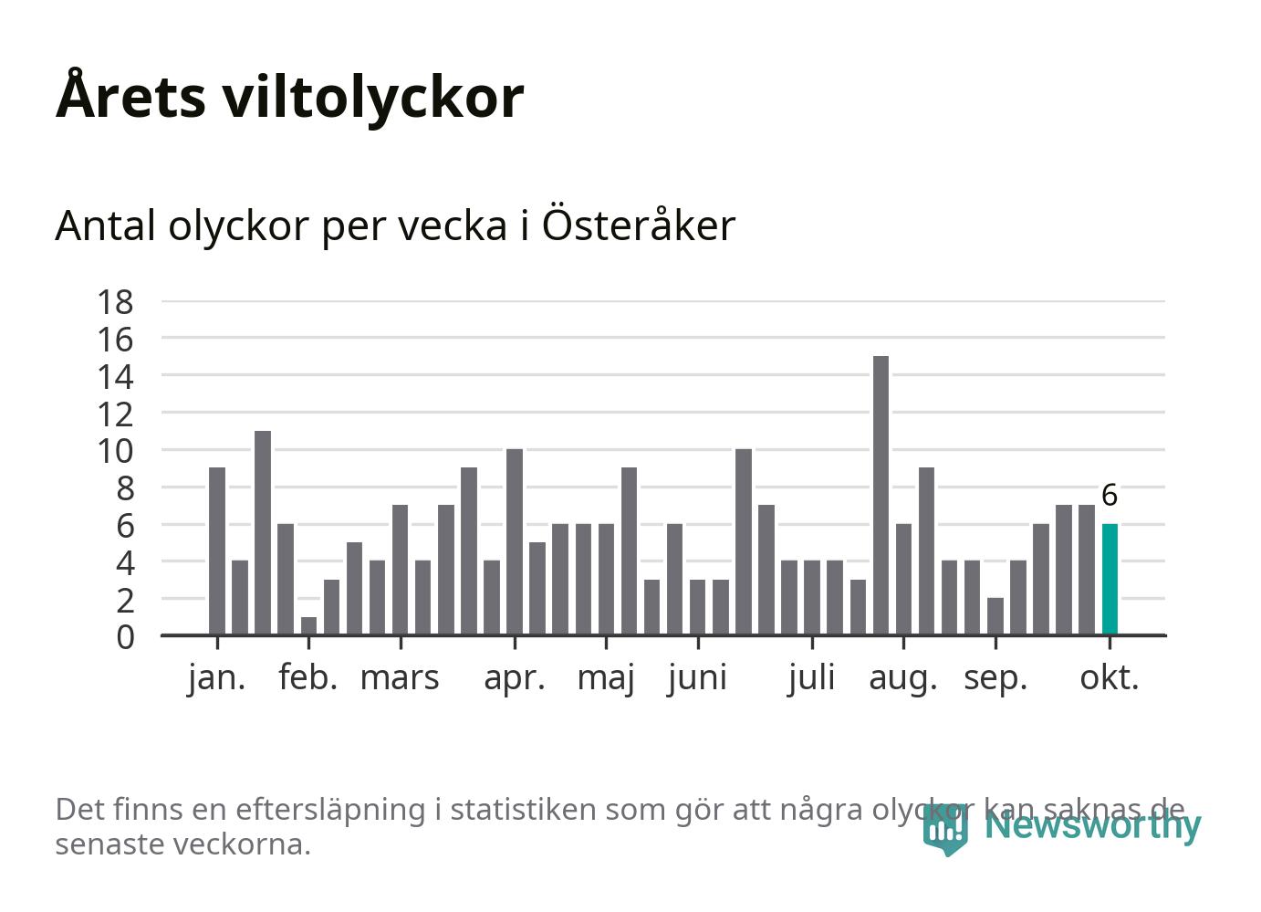 Hittills har sex viltolyckor rapporterats in i Österåkers kommun från vecka 41. Se listan här.