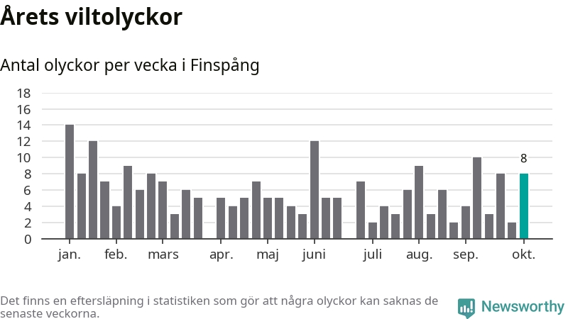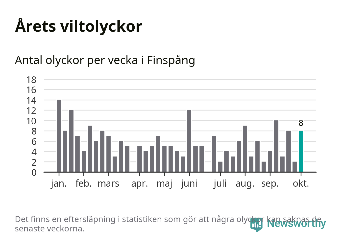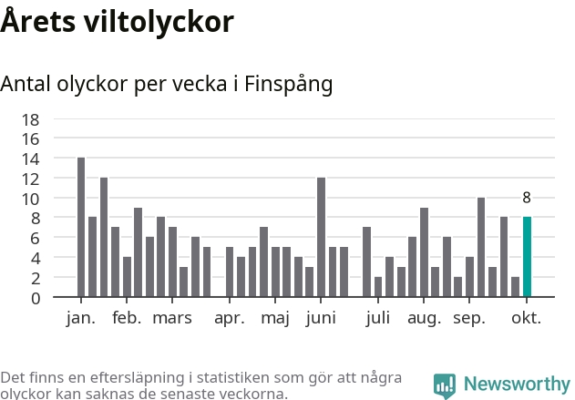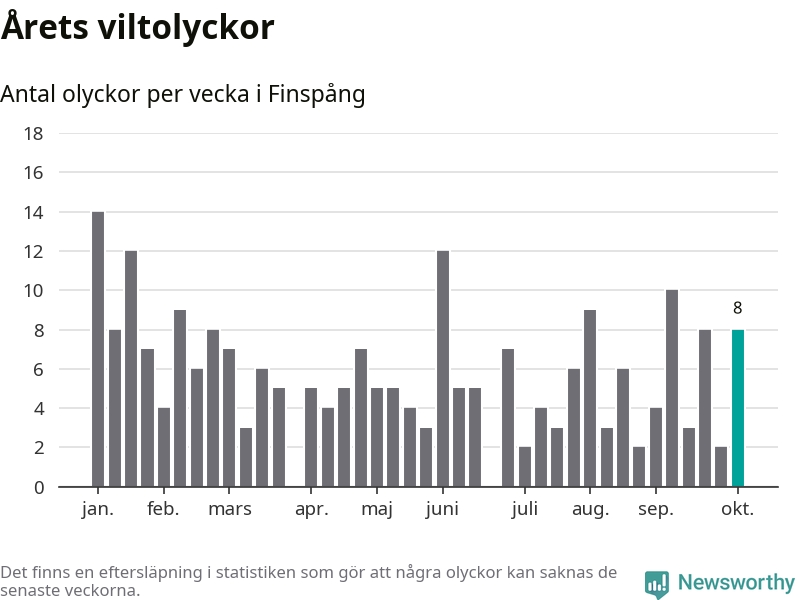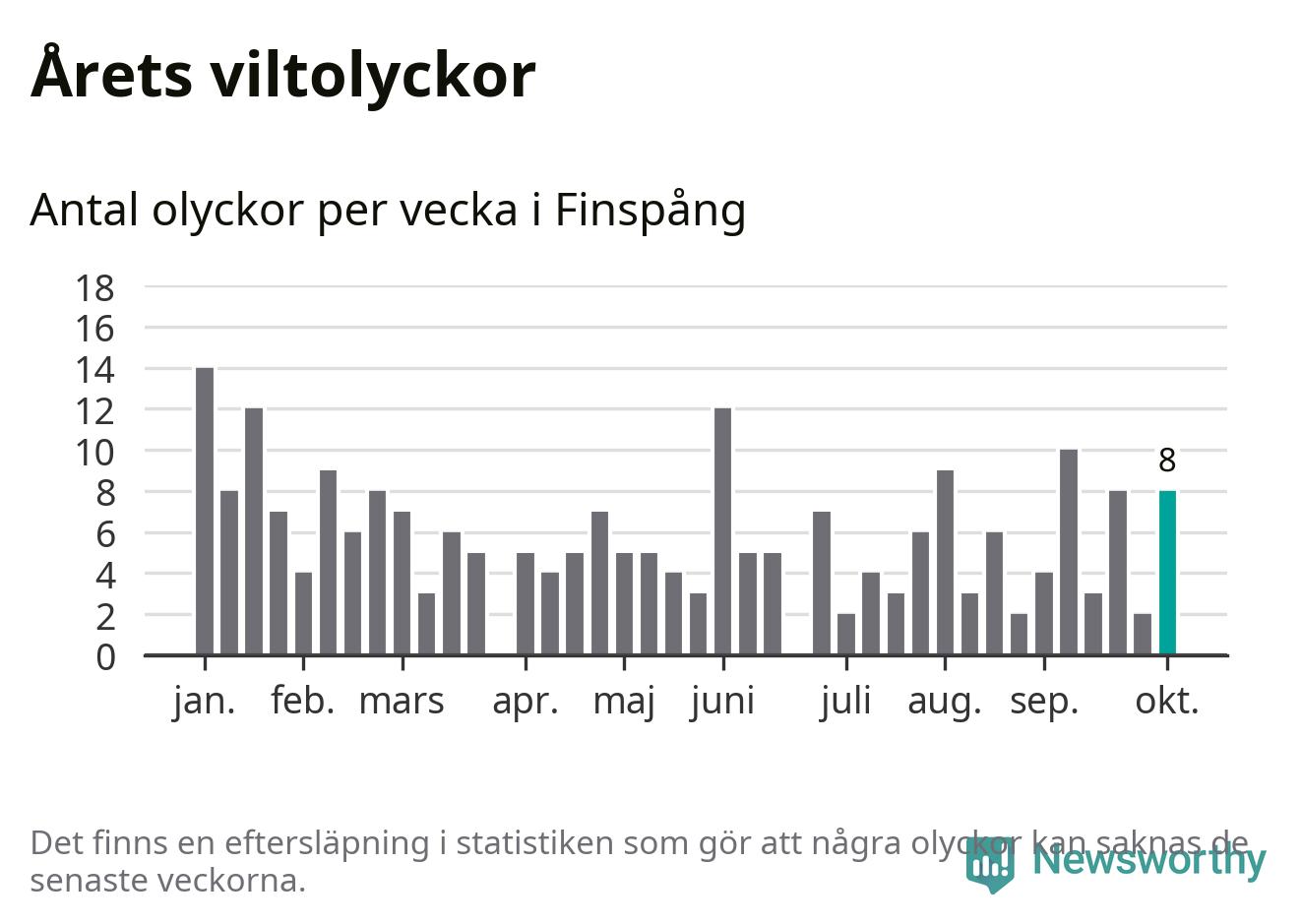 Hittills har åtta viltolyckor rapporterats in i Finspångs kommun från vecka 41. Se listan här.